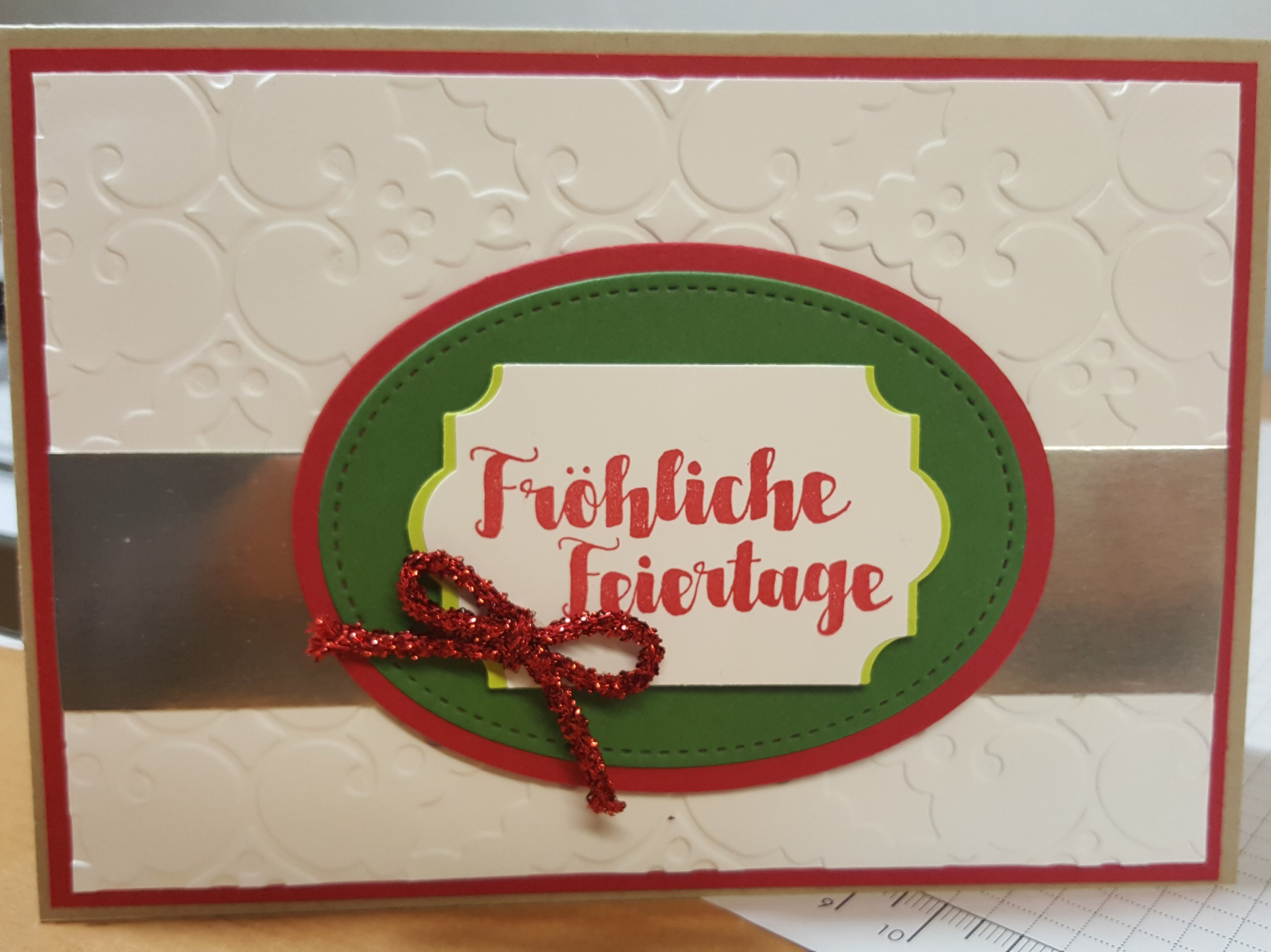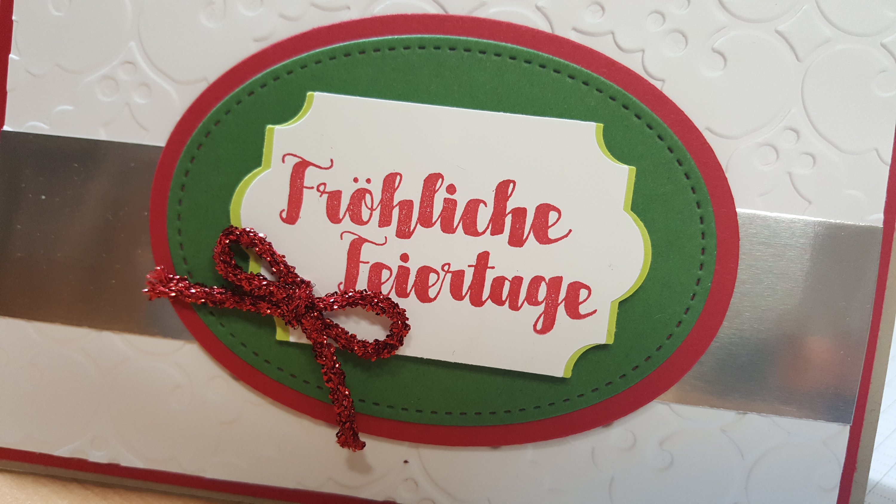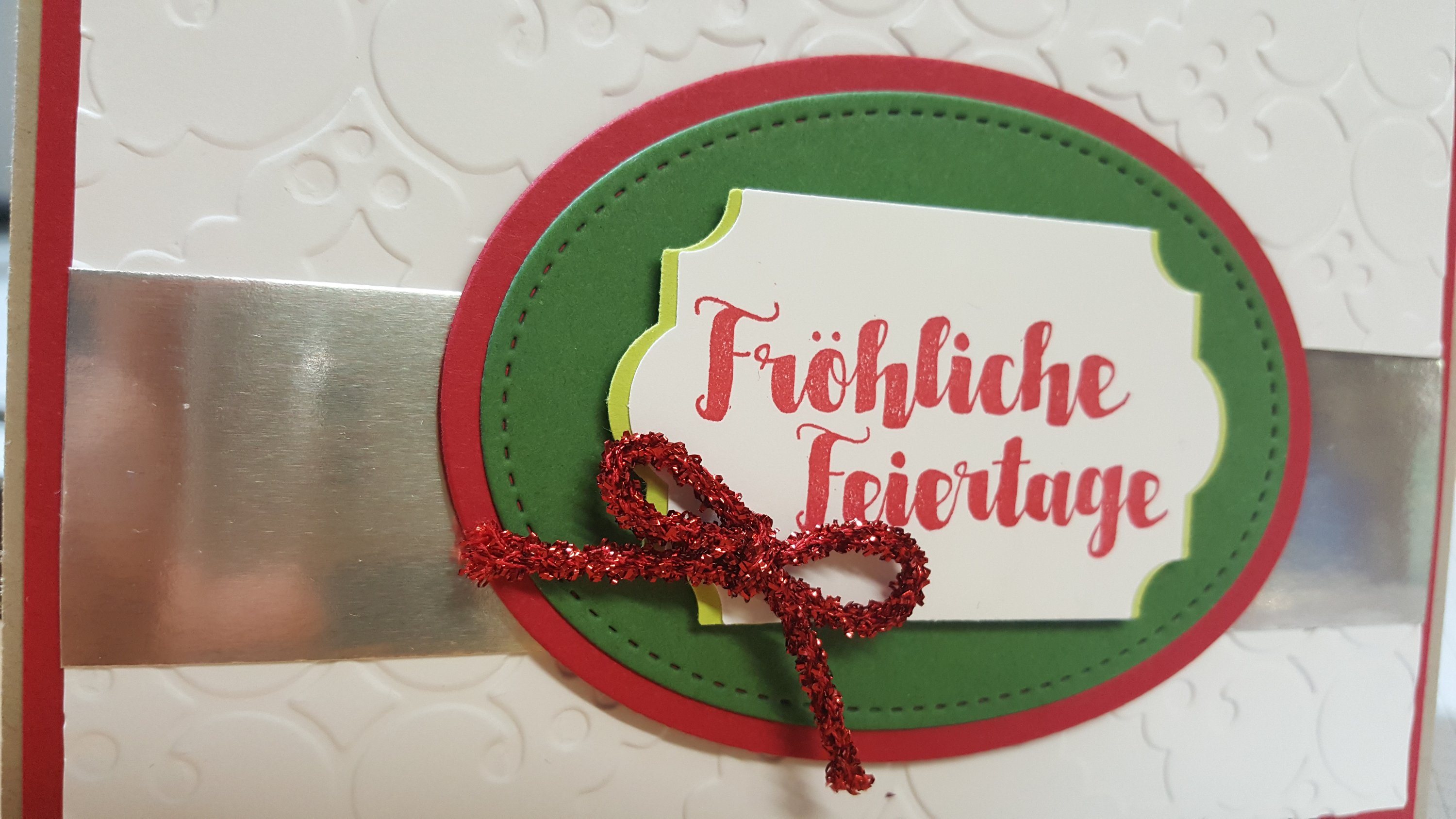 Hier zeige ich euch eine Weihnachtskarte, die ihr mit wenig Aufwand nachbasteln könnt. Ihr braucht allerdings Stanzformen für die BigShot. So sieht meine Weihnachtskarte Fröhliche Feiertage aus:
