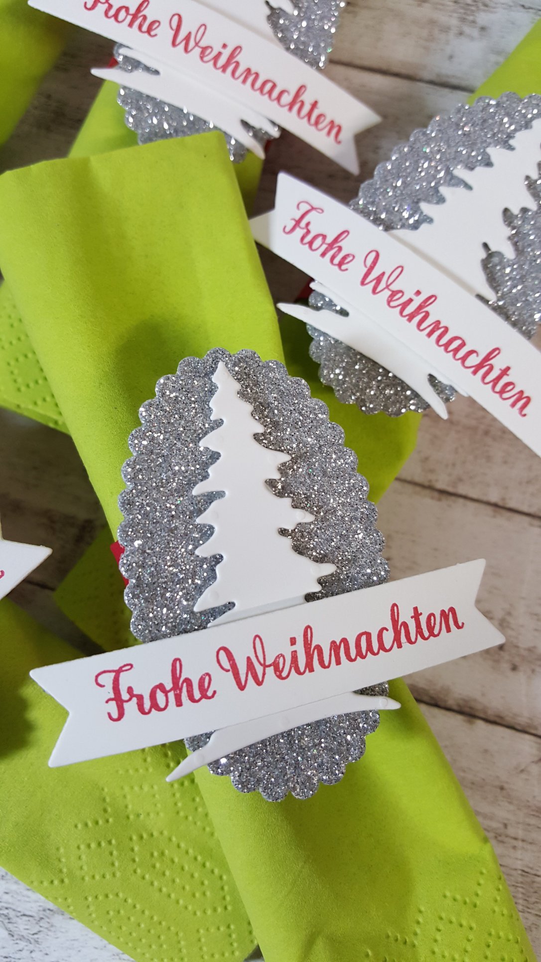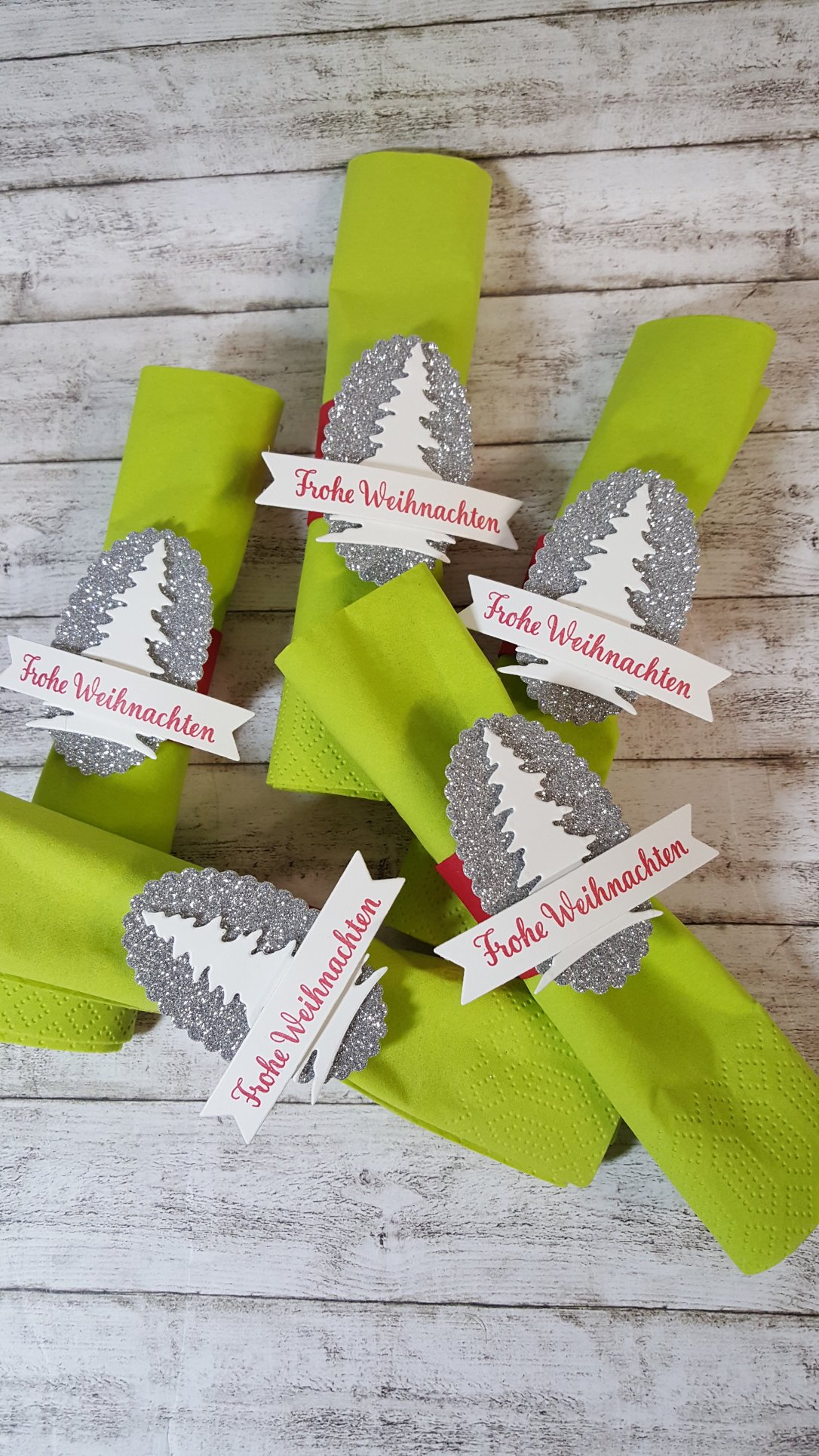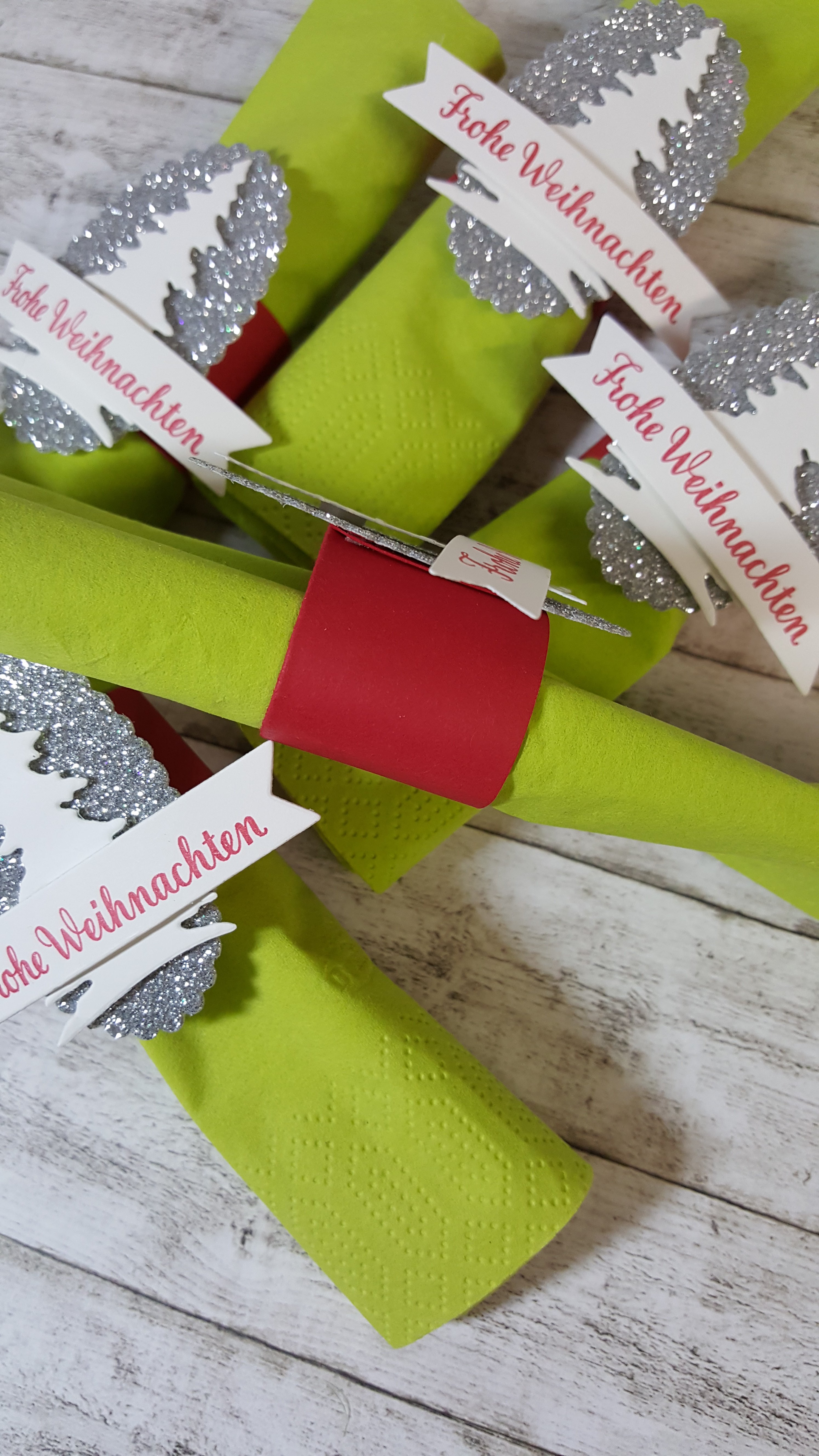 passend zu meinen Tischkärtchen „Zuckerstange“ habe ich Serviettenring gebastelt. Für die Dekoration habe ich die Tannenbäume genutzt, die beim Basteln der Lichterhäuschen „abgefallen“ sind. So sehen die Serviettenring aus: