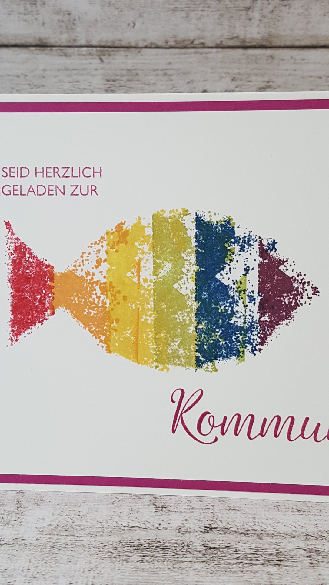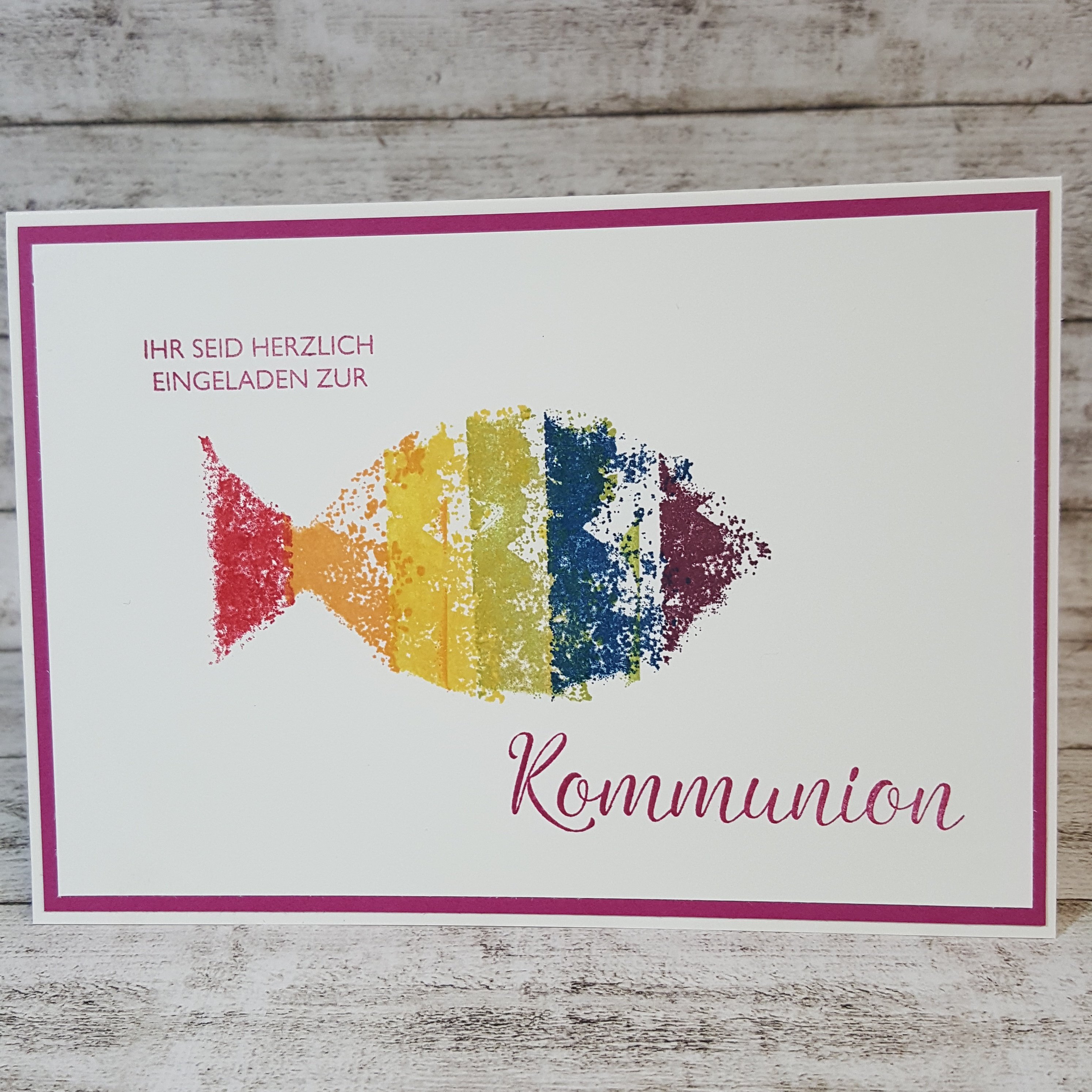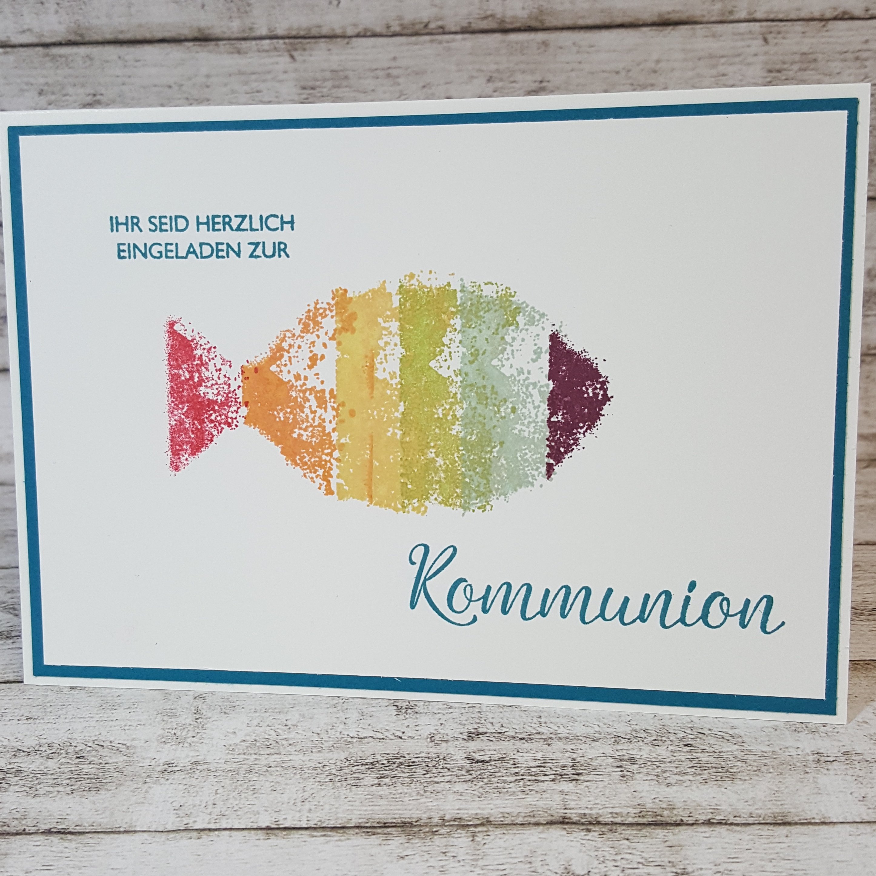 Und was braucht man dann? Klar, Einladungskarten. In den nächsten paar Tagen / Wochen möchte ich euch Ideen für Einladungskarten / Glückwunschkarten zur Kommunion zeigen, die ich mit Produkten von stampin up basteln werde. Los geht es mit dem „Regenbogenfisch“. So sieht die Karte aus:
