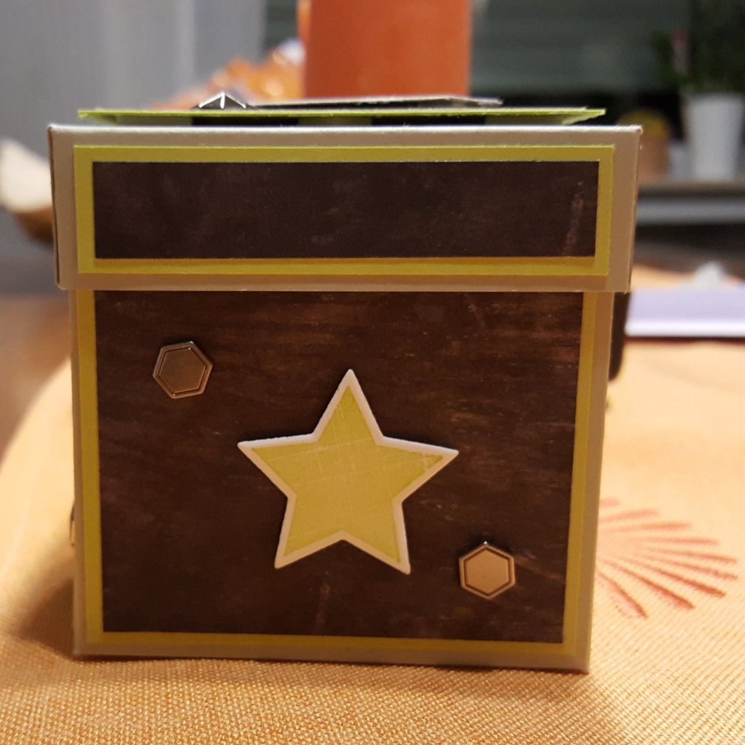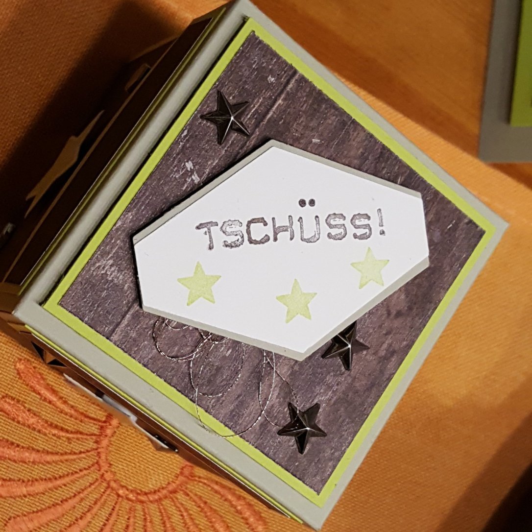 Heute zeige ich euch eine weitere Explosionsbox. Ich habe sie für einen Mann gefertigt, der zum Abschied in den Ruhestand ein Geldgeschenk von den Kollegen erhalten wird. Also habe ich auf das neue Stempelset „Gruß nach Maß“ nebst passender Handstanze zurück gegriffen.