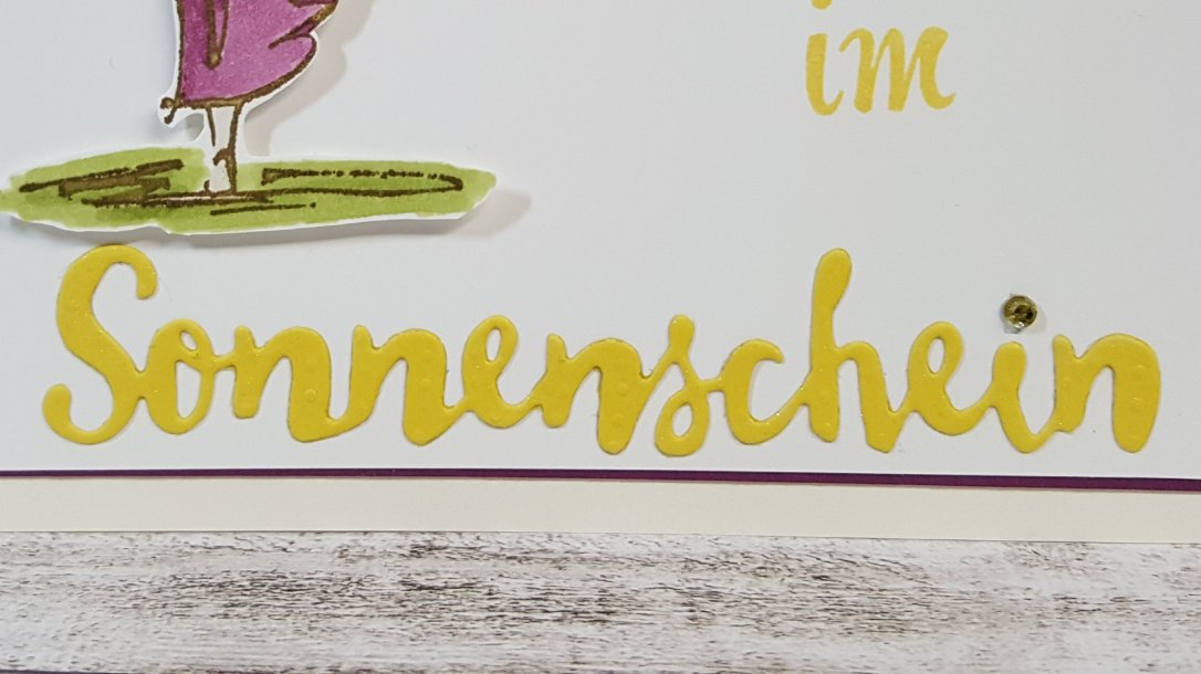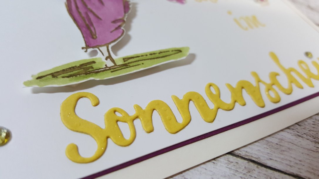 Den Schriftzug „Sonnenschein“ habe ich mit den Thinlits Formen Grüße voller Sonnenschein in Osterglocke ausgestanzt.