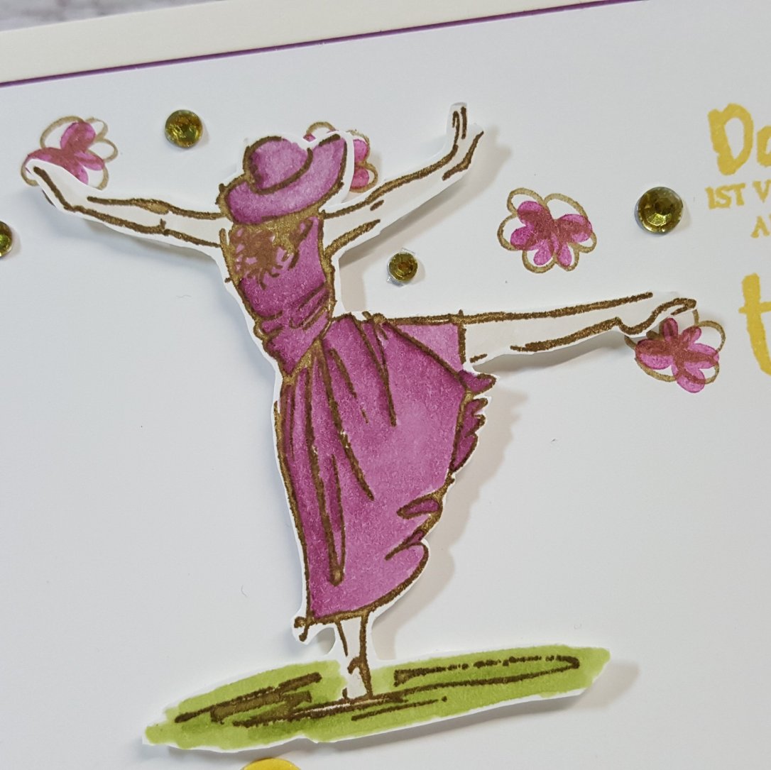 Um die Karte zu gestalten, habe ich auf drei meiner Lieblingsprodukte zurück gegriffen. Die tanzende Frau, die ich mit den stampin blends in Himbeerrot colouriert habe, ist aus dem Stempelset „Mit Stil“ von stampin up.