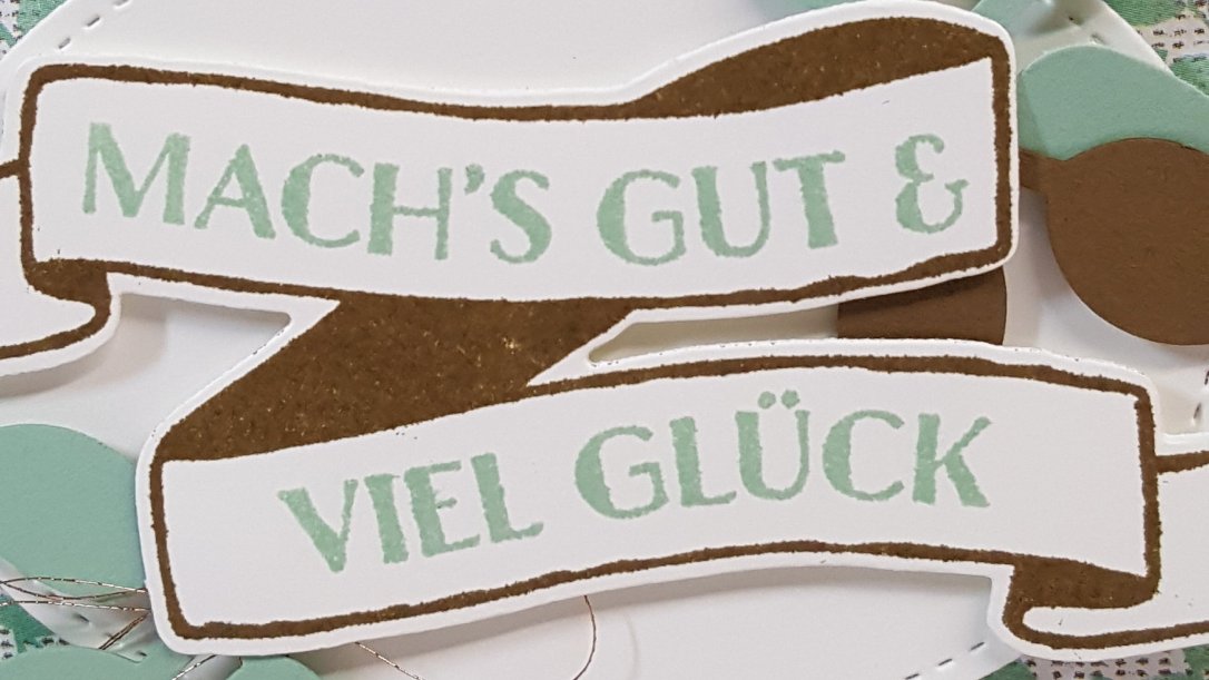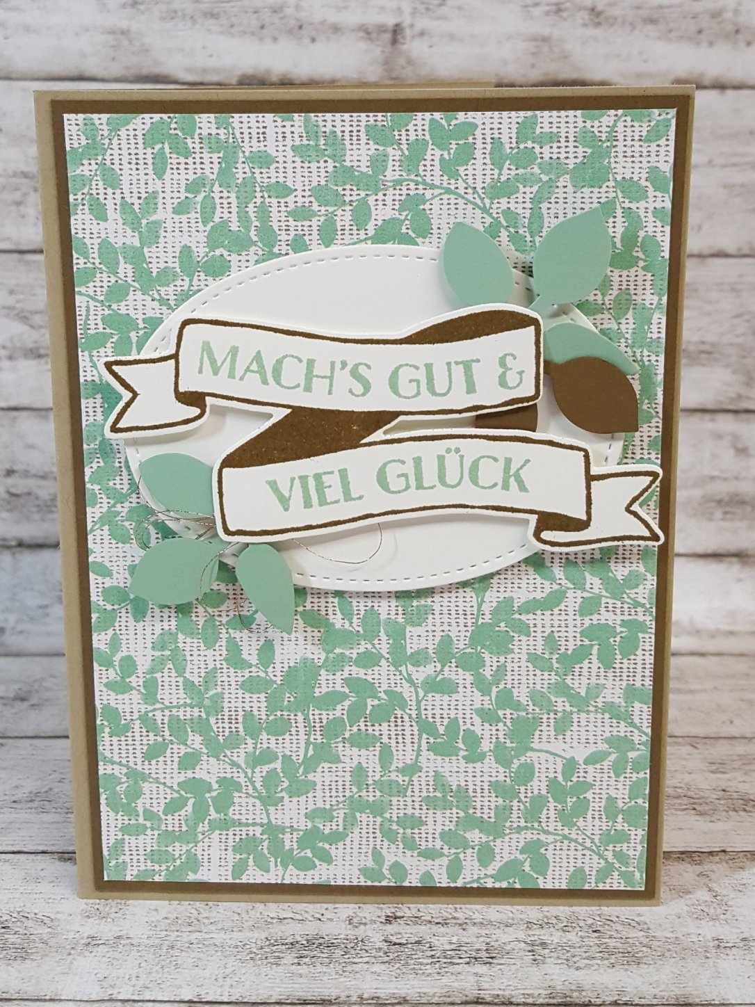 Genutzt habe ich das neue Designerpapier Poesie der Natur. Als Stempelfarbe habe ich MINZMAKRONE (juhu) und Wildleder genutzt. Den Spruch habe ich aus dem Stempelset Bannerweise Grüße entnommen, den ich mit dem passenden Farmelit aus dem Set Bunter Bannermix ausgestanzt habe.