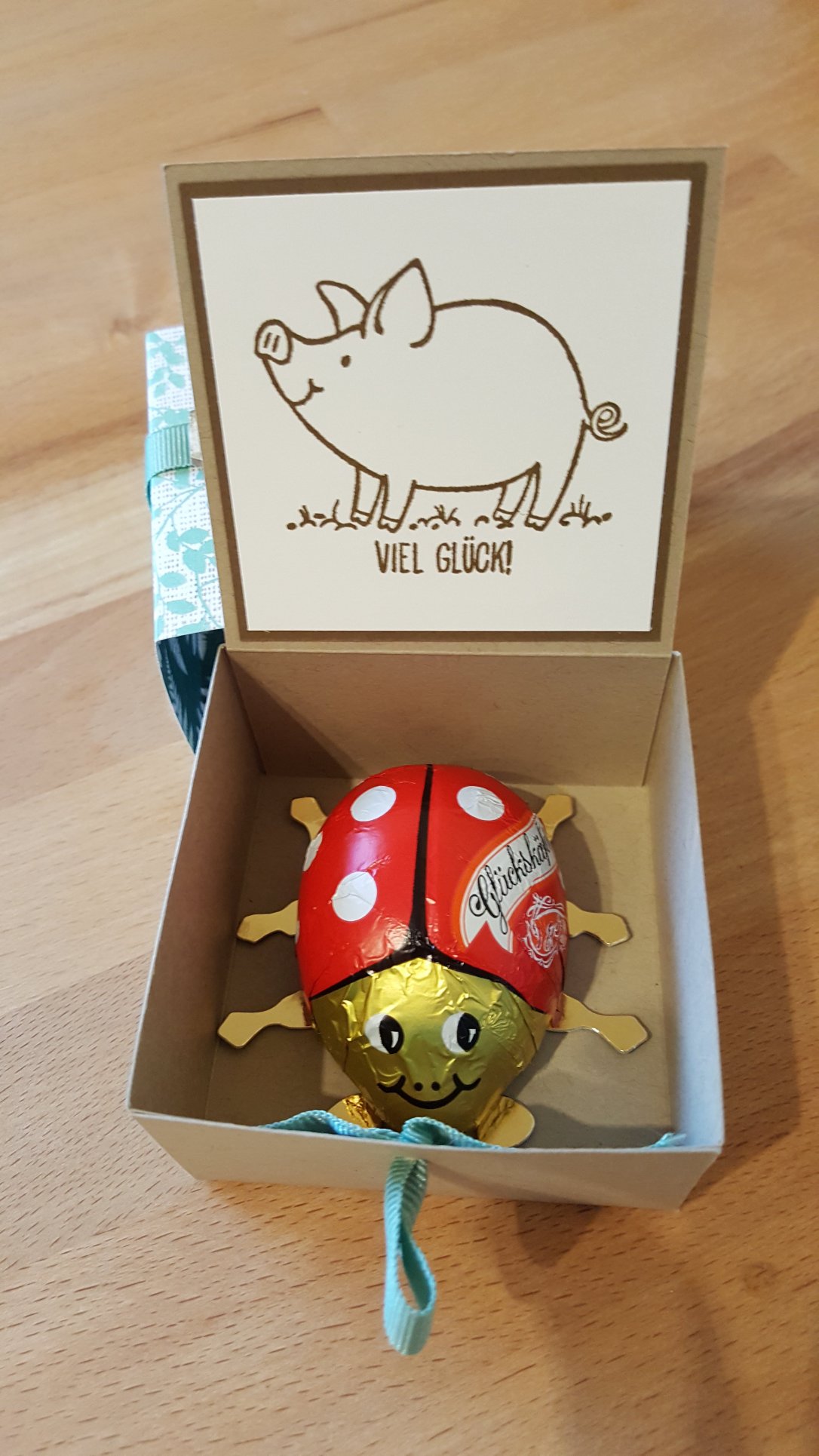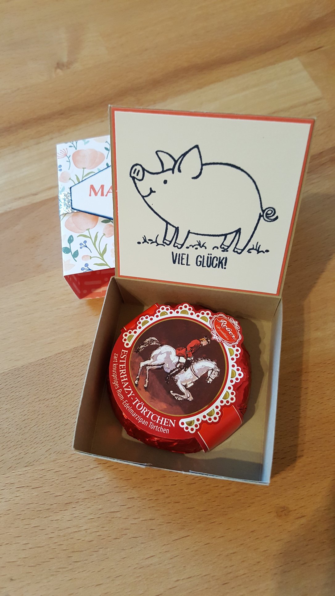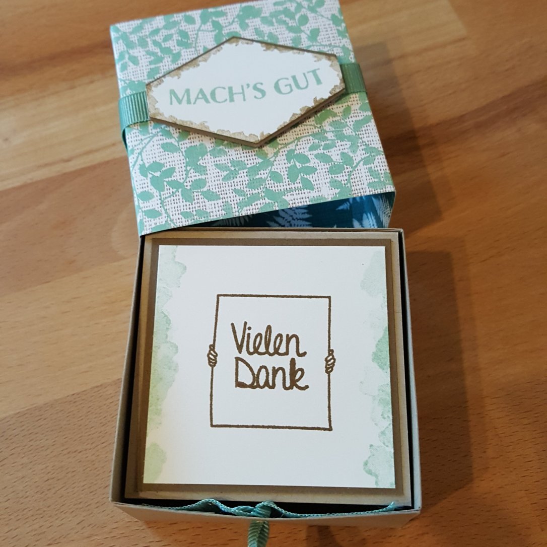 Ich durfte – hoffentlich nun wirklich für längere Zeit – noch mal etwas zum Abschied von Kollegen basteln. Dieses mal ist es eine kleine Box mit einer Süssigkeit. So sehen die Boxen aus: