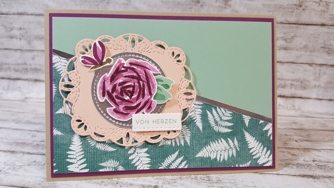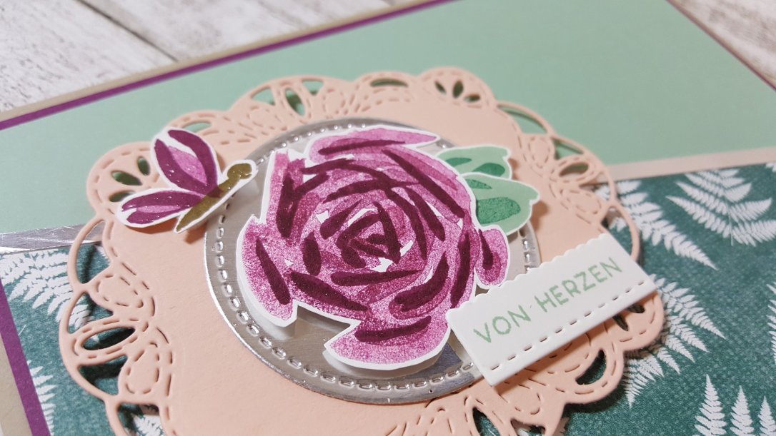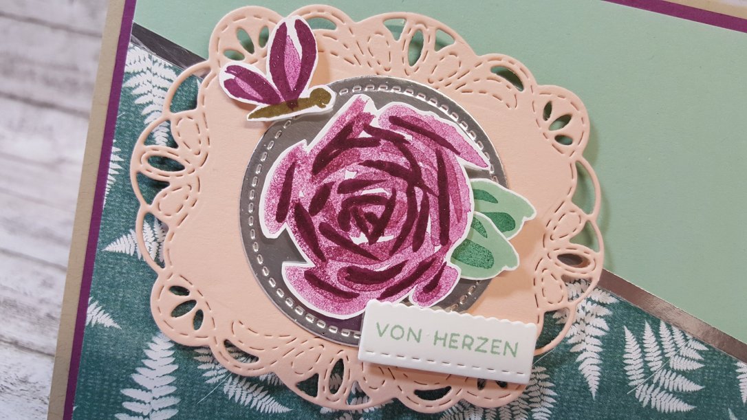 Die Blume und die Blätter stammen aus dem Stempelset Frühlingsfreude. Aus dem gleichen Set stammt auch der Schmetterling. Der Spruch ist aus dem Stempelset Bestickte Grüße.