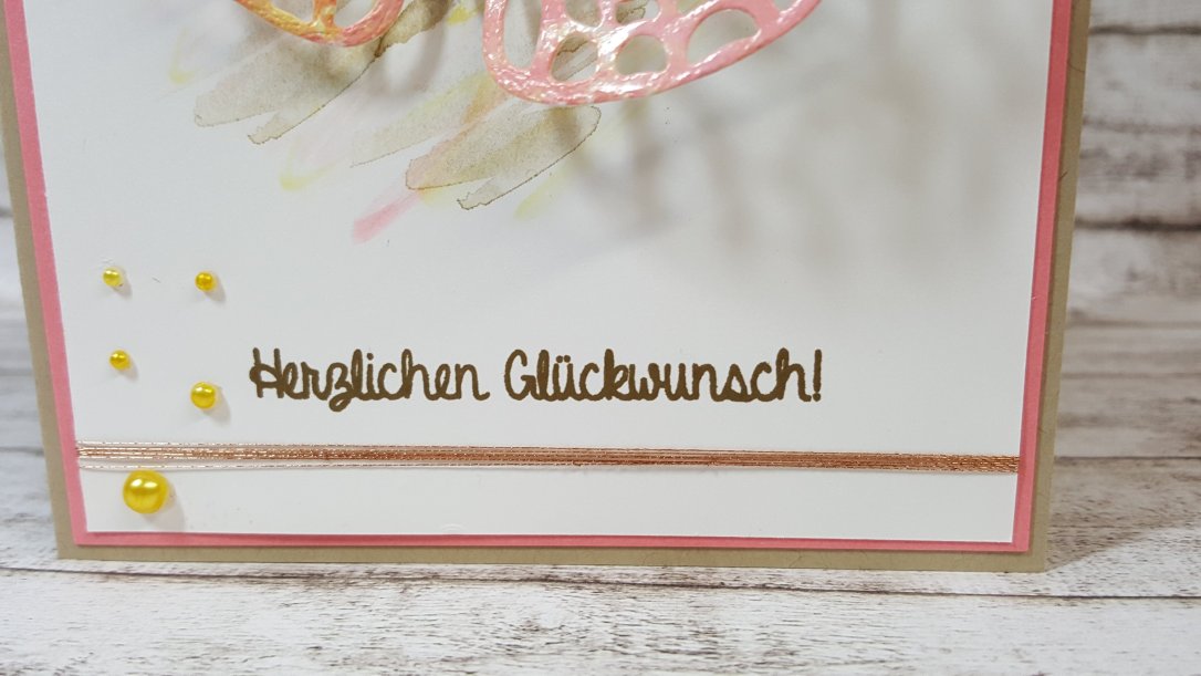 Den Hintergrund habe ich in Wildmoos mit einem Stempel aus dem Stempelset Mit Stil von stampin up gestaltet. Zim Schluss habe ich noch Osterglocke und Flamingorot mit dem Wassertankpinsel ganz sanft aufgetreten und besprenkelt.