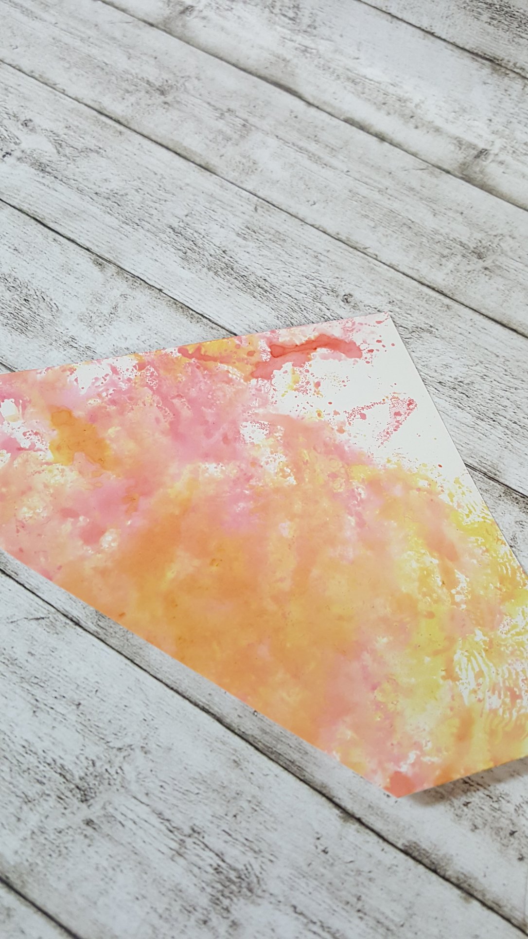 Ich wollte mal wieder mit Wasser spielen und so habe ich mir das Glanzpapier genommen, Osterglocke und Flamingorot auf Folie getupft, mit Wasser besprengt und diese nasse Folie auf den Glanzkarton gedrückt. Dies habe ich mehrfach wiederholt und aus dem Ergebnis, das so aussieht