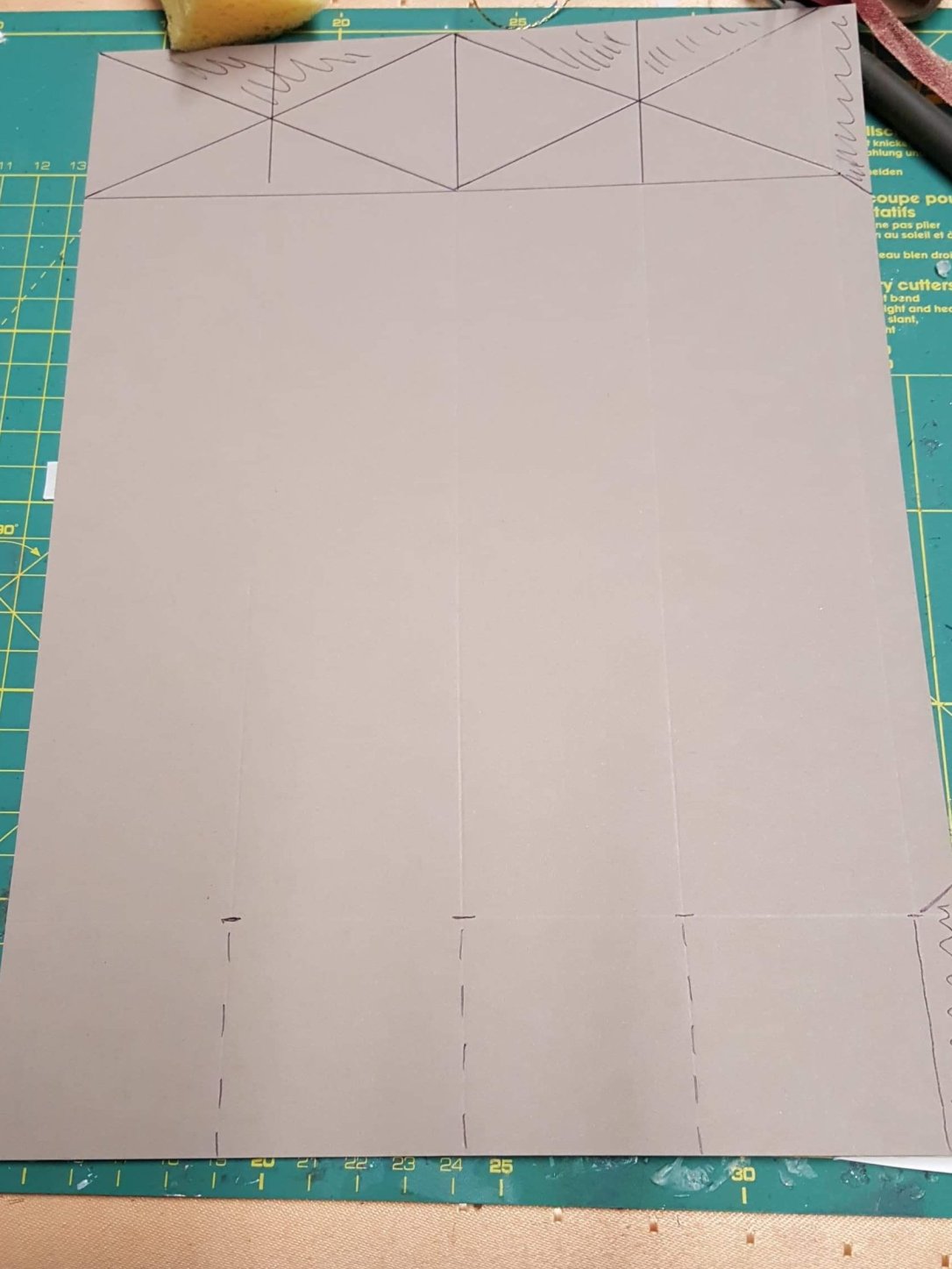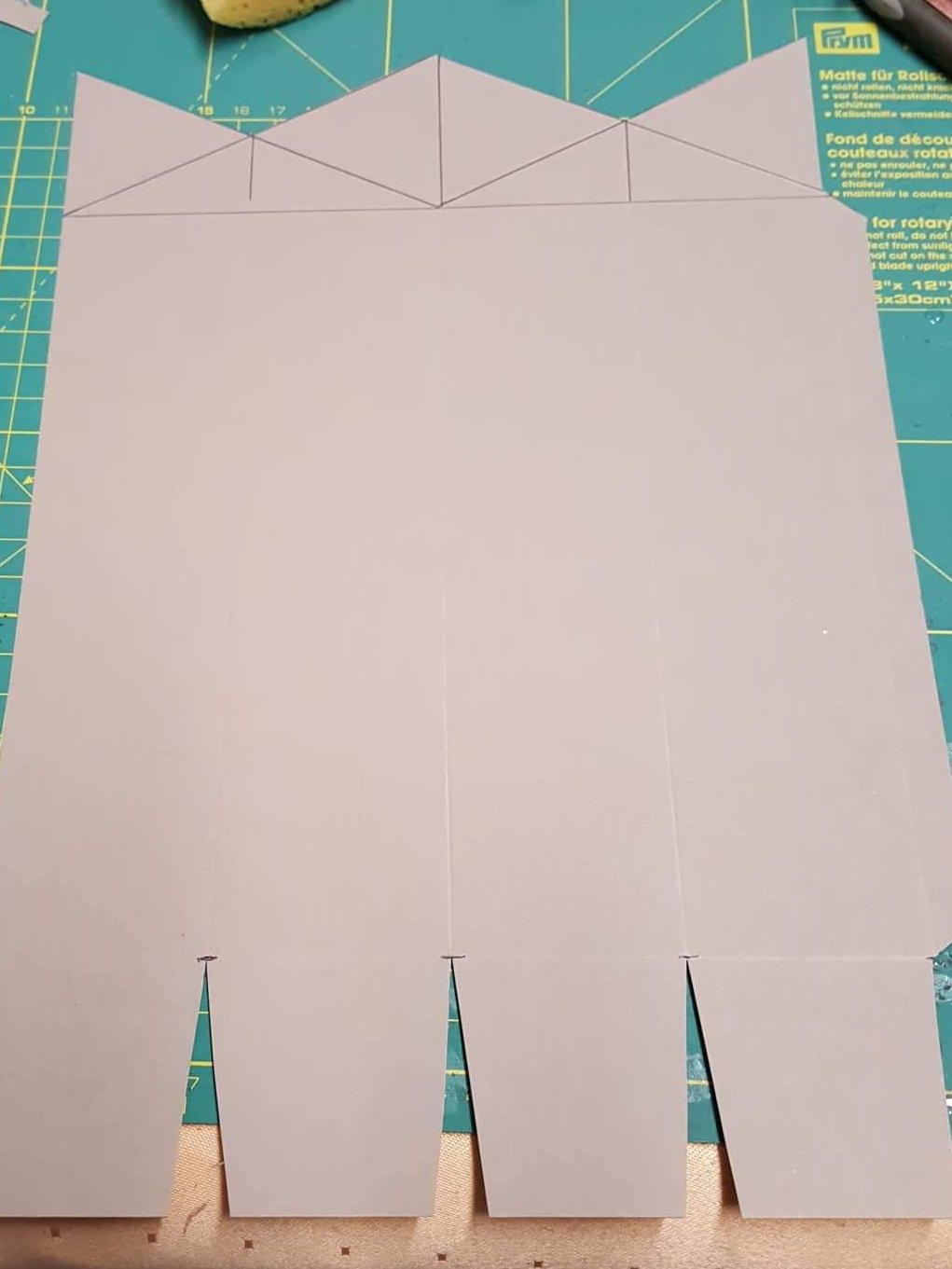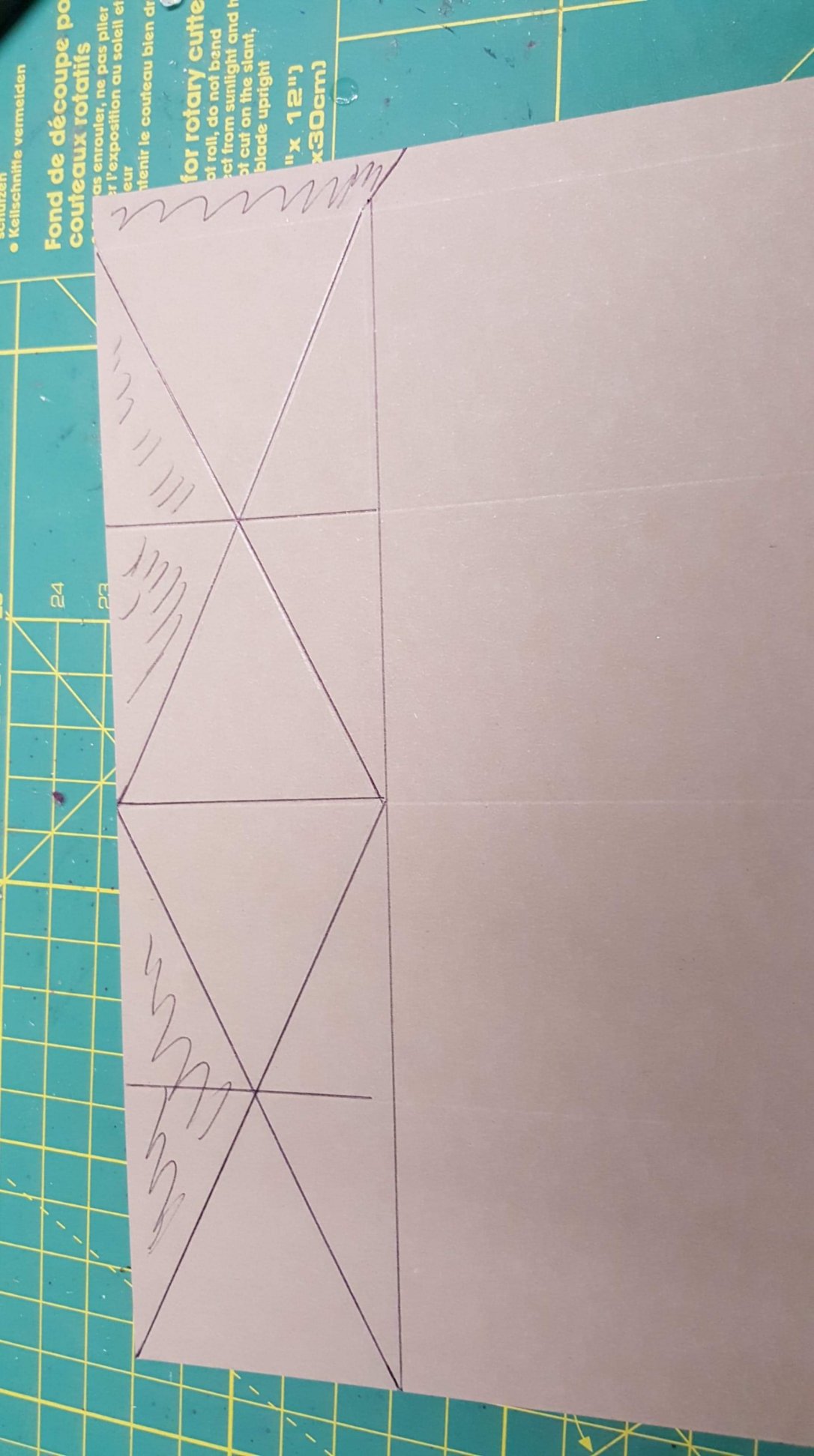 Ihr nehmt ein Stück 6″ * 6″ und falzt eine der Seiten bei 3,5 cm / 7 cm / 10,5 cm / 14 cm. Dann dreht ihr den Cardstock km 90 Grad und falzt bei der anderen Seite bei 3,5 cm. Dann dreht ihr den Cardstock um 180 Grad und macht dort bei 3,5 eine leichte Falz. Jetzt müsst ihr dort „X“ falzen. Und zwar so: