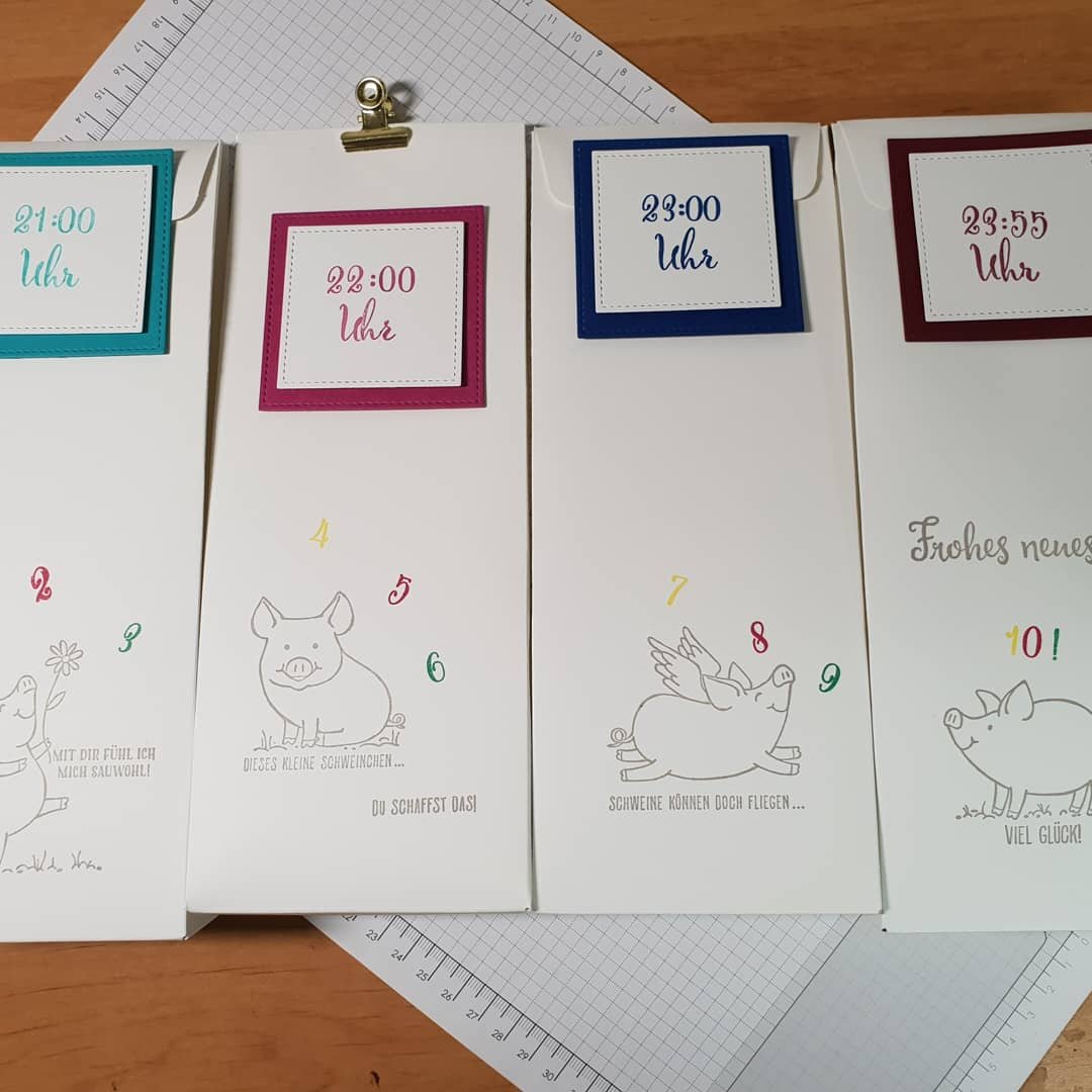 Sie sind mit dem Tütenboard aus einem 12″ * 12″ – Bogen gemacht. Für die Dekoration habe ich das Stempelset Glücksschweine, das Set die Kreativwerkstatt und die Stanzen Stickmuster – alles von stampin up – genutzt.