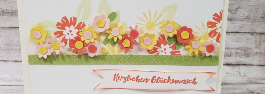 Hallo ihr Lieben, Heute zeige ich euch eine Glückwunschkarte. Ich diese habe ich mit dem Stempelset Bloom by Bloom von stampin up gefertigt. Hättet ihr das gedacht? Ich habe mit der Maskentechnik eine Blumenwiese in Puderrosa, Osterglocke, Calypso und Farngrün. Den Spruch habe ich dem Set Eisblüten entnommen. Wie ich die Karte gemacht habe, könnt… Weiterlesen Glückwunschkarte mit dem Stempelset Bloom by Bloom von stampin up