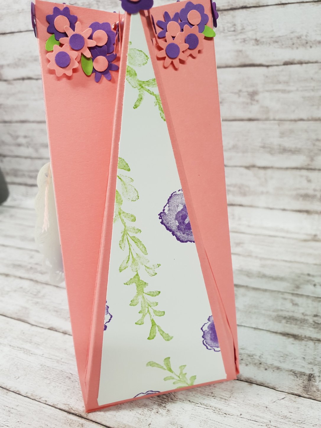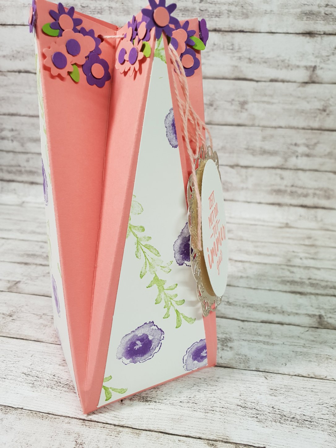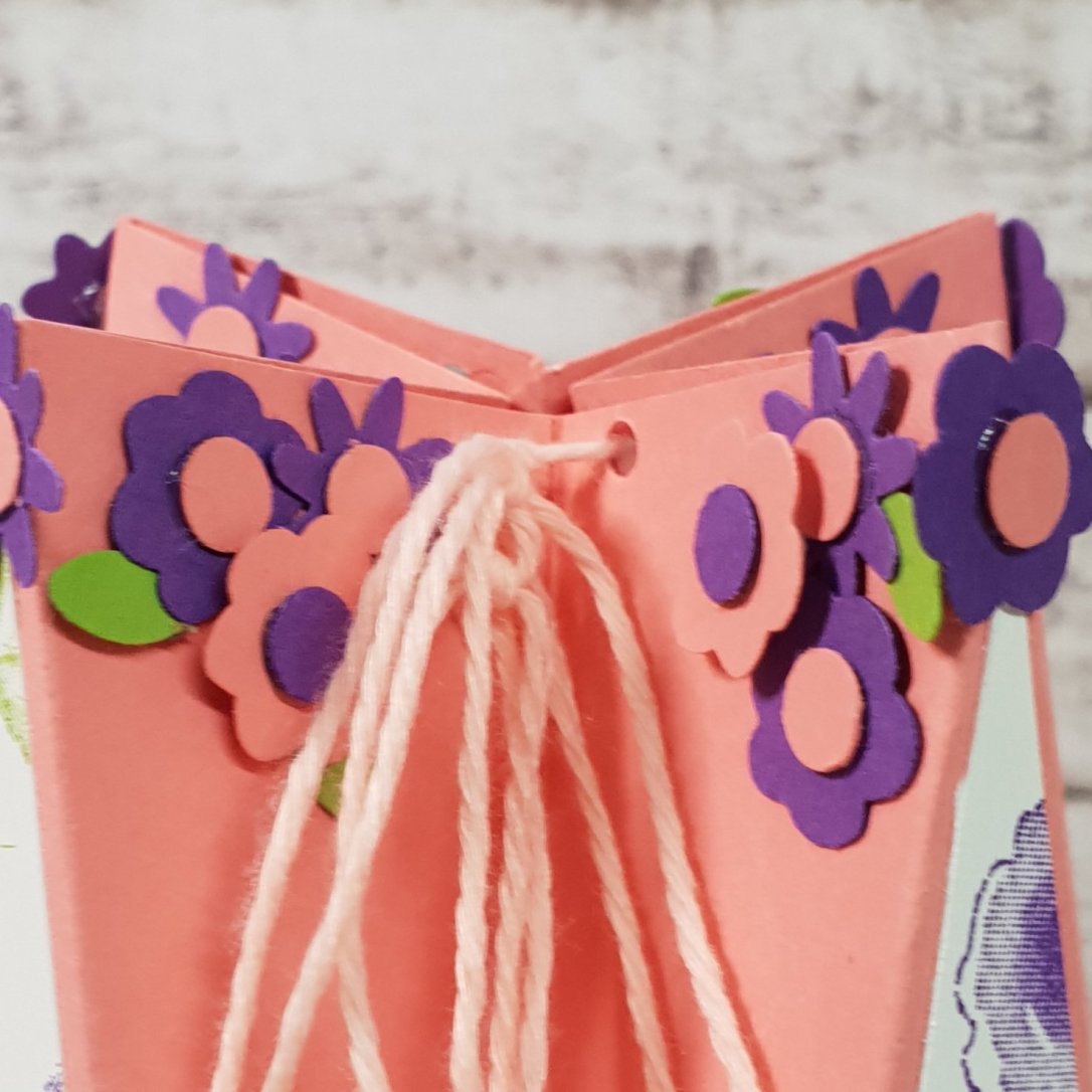 Glücklicherweise war meine erste Bestellung aus dem Frühjahr-/Sommerkataloge von stampin up schon da. Und so konnte ich einen Fehler mit den Miniblumen, die ich mit den neuen Ity Bity Stanzen gemacht habe, verdecken. Ich hatte nämlich die Löcher für die Kordel von falsch gestanzt. Und so hab ich einfach oben einen Blütenrand gemacht: