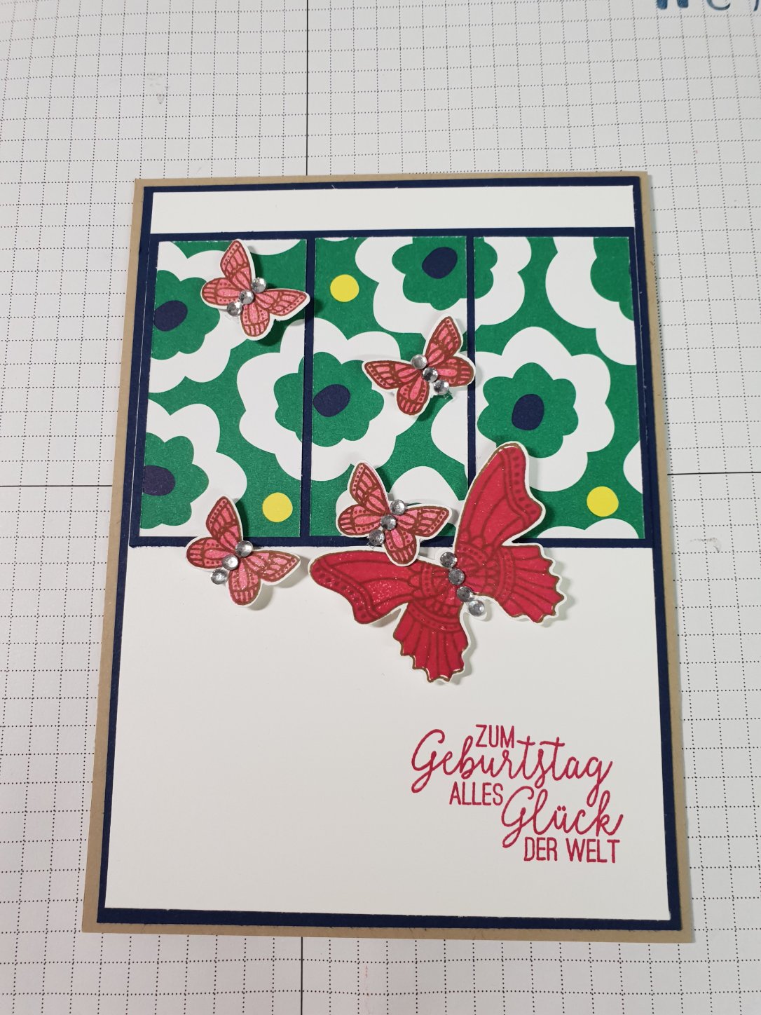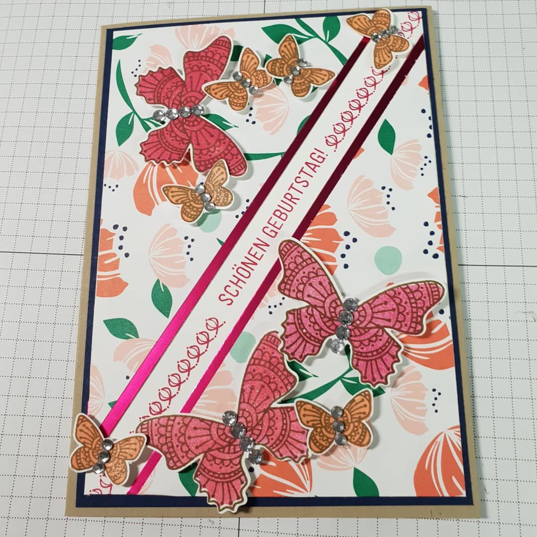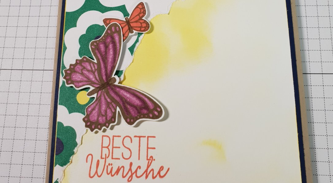 Hier habe ich neben dem DSP das Produktpaket Schmetterlingsglück von stampin up genutzt. Den Hintergrund habe ich in Ananas gewischt.