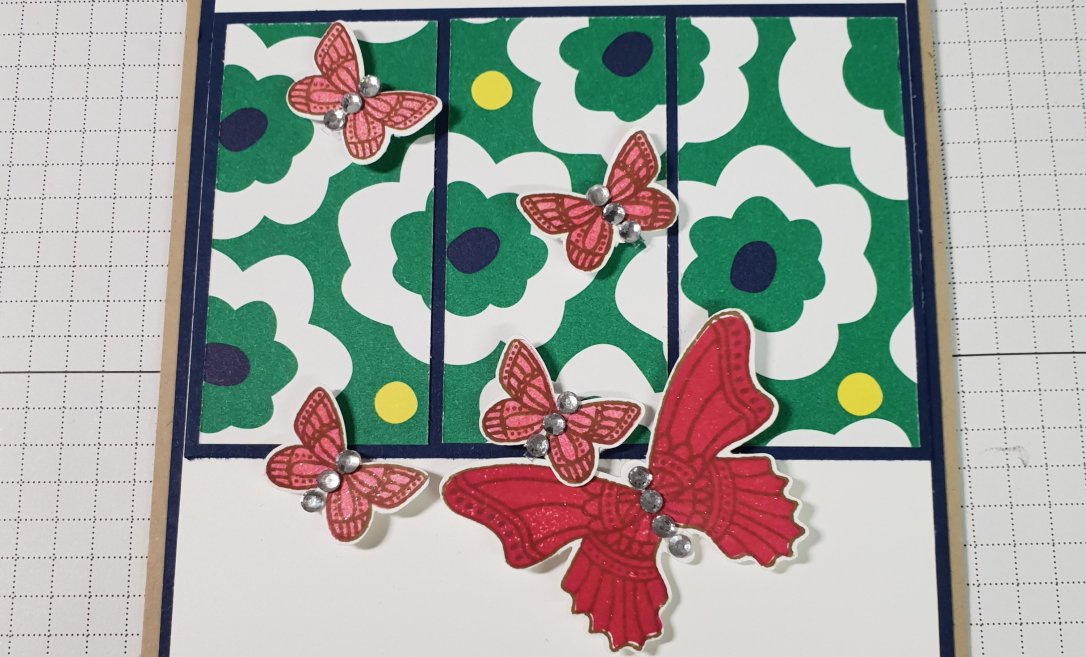 Hier habe ich neben dem DSP das Produktpaket Schmetterlingsglück von stampin up, das Stempelset Glücksfälle und die Folie in Kussrot aus der SAB.