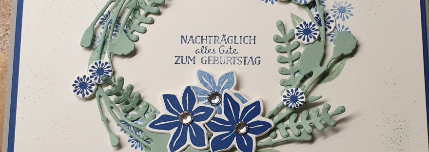Hallo ihr Lieben, Ich hoffe, das Hochladen klappt nun endlich wieder. Ich versuche es einfach mal. Ich brauchte eine Geburtstagskarte in blau und mint. Deshalb habe ich mich für die Farbkombination Blaubeere und Minzmakrone entschieden. Da ich die Karte nicht rechtzeitig losschicken konnte , musste ein "nachträglich " in den Spruch integriert sein. Glücklicherweise habe… Weiterlesen Glückwunschkarte mit dem Stempelset Blüten des Augenblicks von SU und der Stanze Blumenkranz von creative depot