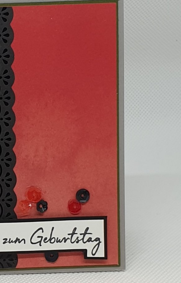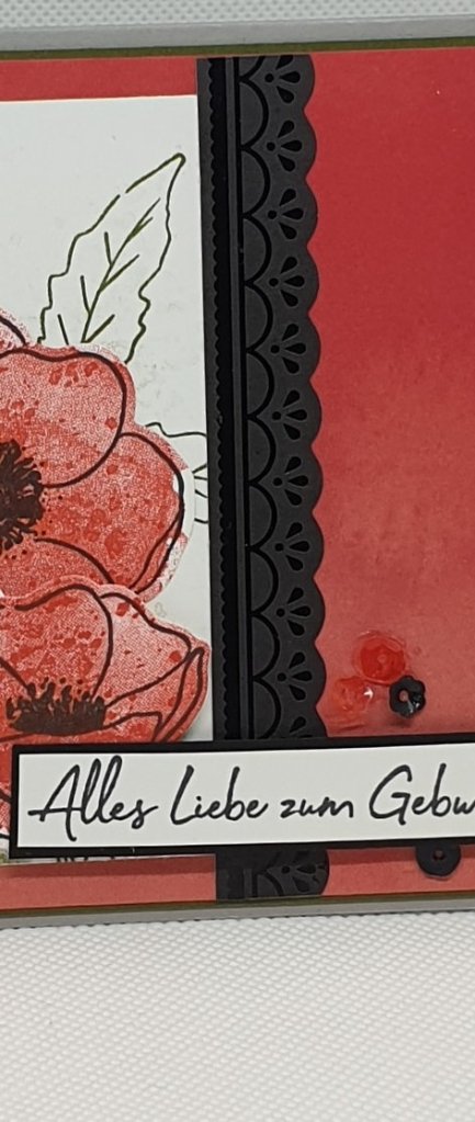 Beim Designerpapier habe ich die „ruhige“ Rückseite in Blutorange als Hintergrund ausgesucht. Die Farbe knallt, oder? Die Pailletten sind aus den Pailletten Mohnblütenzauber.