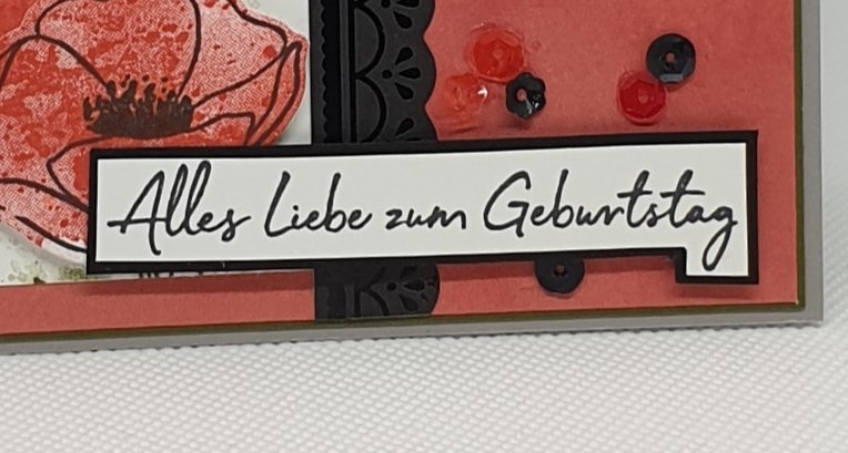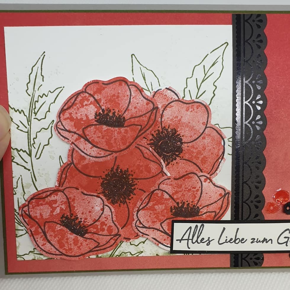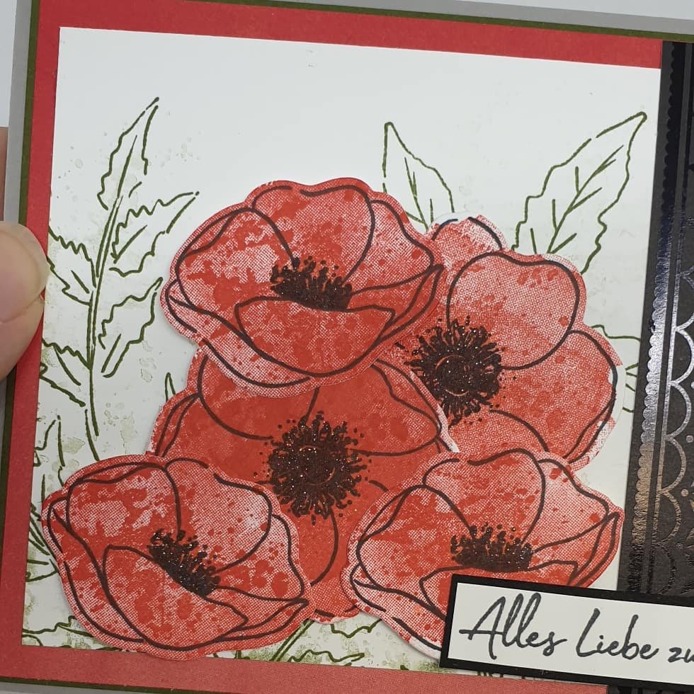Die Mohnblüten habe ich übrigens in Blutorange gestempelt. Eine wahre Farbexplosion. Zum Abschluss habe ich die Mitte der Mohnblüten noch mit dem Wink of Stella klar beglitzert.