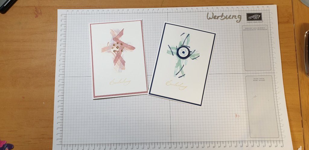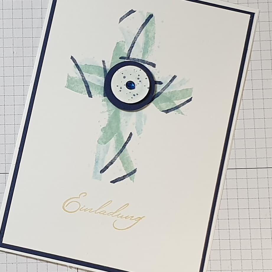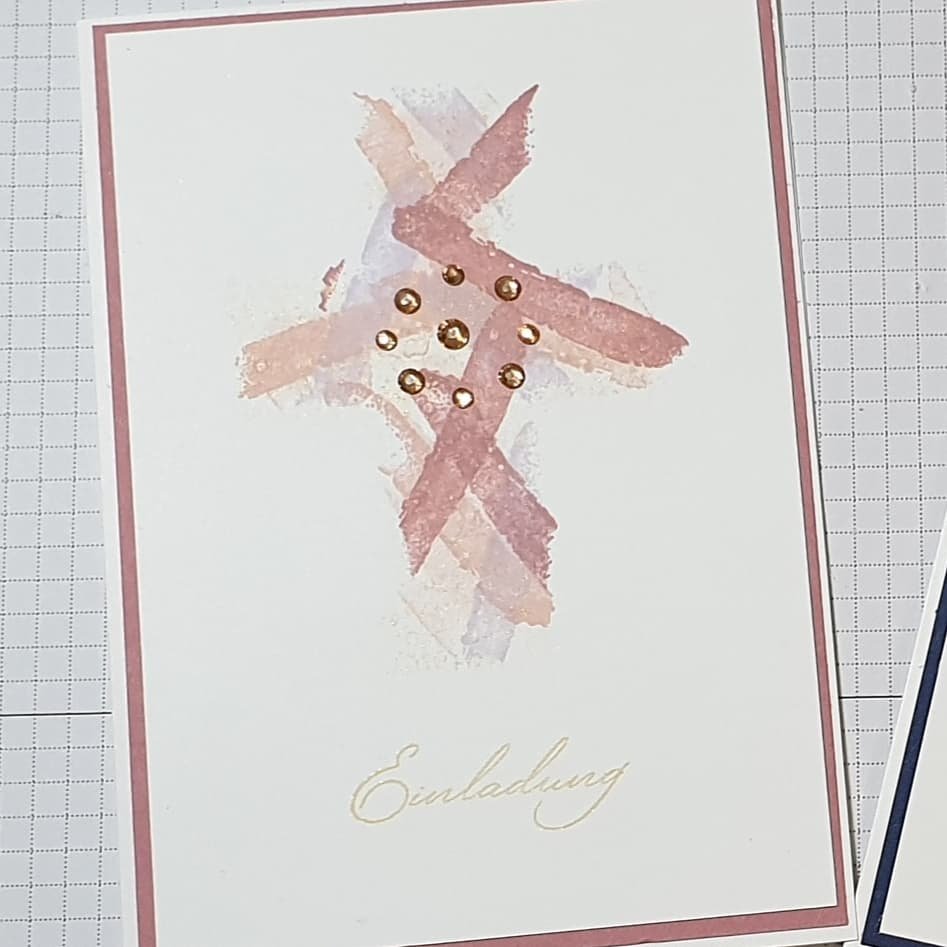 genutzt. „Einladung“ habe ich in Gold gestempelt. Schöner wäre es, den Schriftzug in Gold zu embossen. Mir fehlt aber das goldene Pulver.