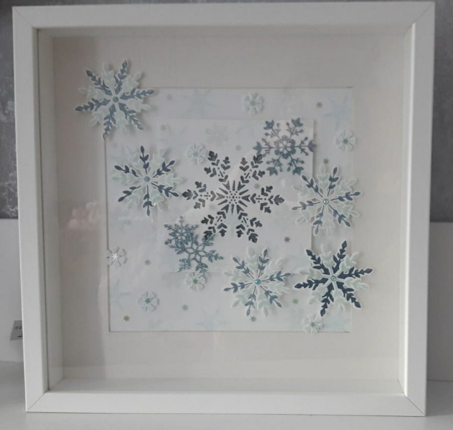 Ich habe mich im Farbspektrum des Designerpapiers bewegt: Babyblau, Abendblau und Aquamarin. Damit auch tagsüber ein Glitzereffekt entsteht, habe ich viele selbstklebende Mini-Schneeflocken verteilt: