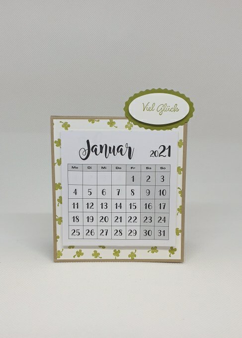 Zum Jahresende verschenke ich gerne Jahreskalender, die ich nett dekoriert habe. Dieses Jahr haben mir drei Bastelkolleginnen ausgeholfen. Zwei Kalender habe ich schon verbastelt. Genutzt habe ich das Produktpaket Ovale Grüße von stampin up. Das kleine Glücksklee ist zuckersüß, oder?