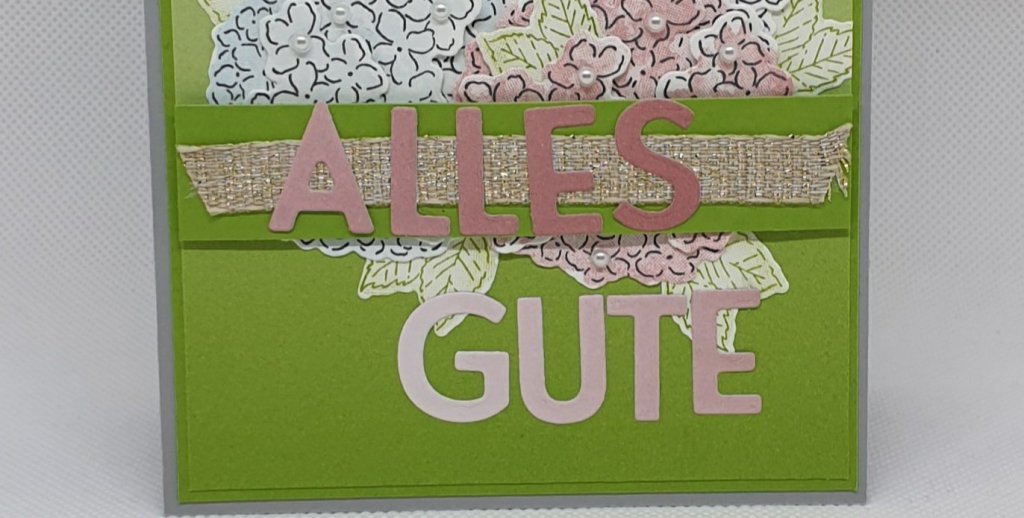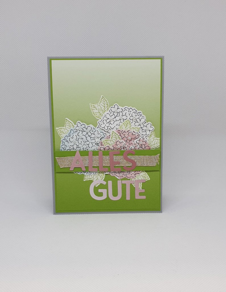 Derzeit liebe ich das Produktpaket Hortensienpark. Und auch für diese Karte habe ich das Produktpaket von stampin up genutzt. So sieht meine Karte aus: