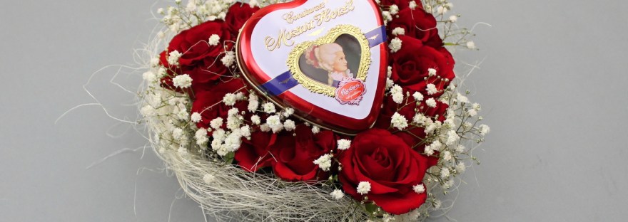 Ein Herzgesteck mit Pralinen für den Valentinstag oder Hochzeitstag