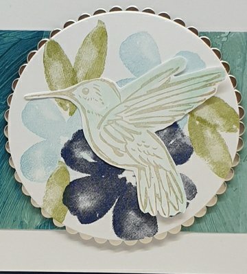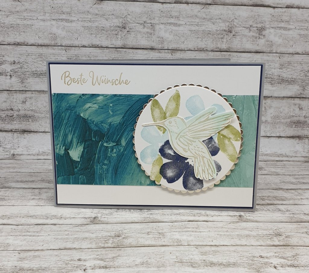 Und das ist meine Karte, die ich für eine Dame gestaltet habe, die Blautöne liebt und bling bling hasst:
