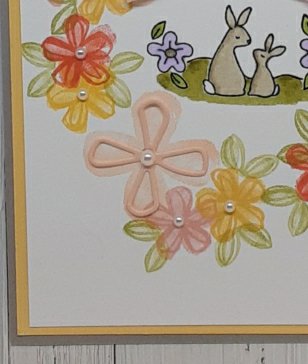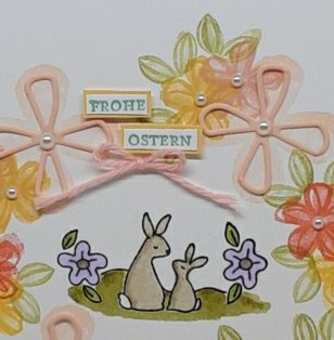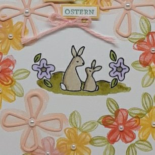 In die Mitte des Blütenkranzes habe ich die Häschen aus dem Stempelset Ovale Grüße gesetzt und diese mit den Stampin blends coloriert. Die Häschen finde ich richtig süß, und ihr?