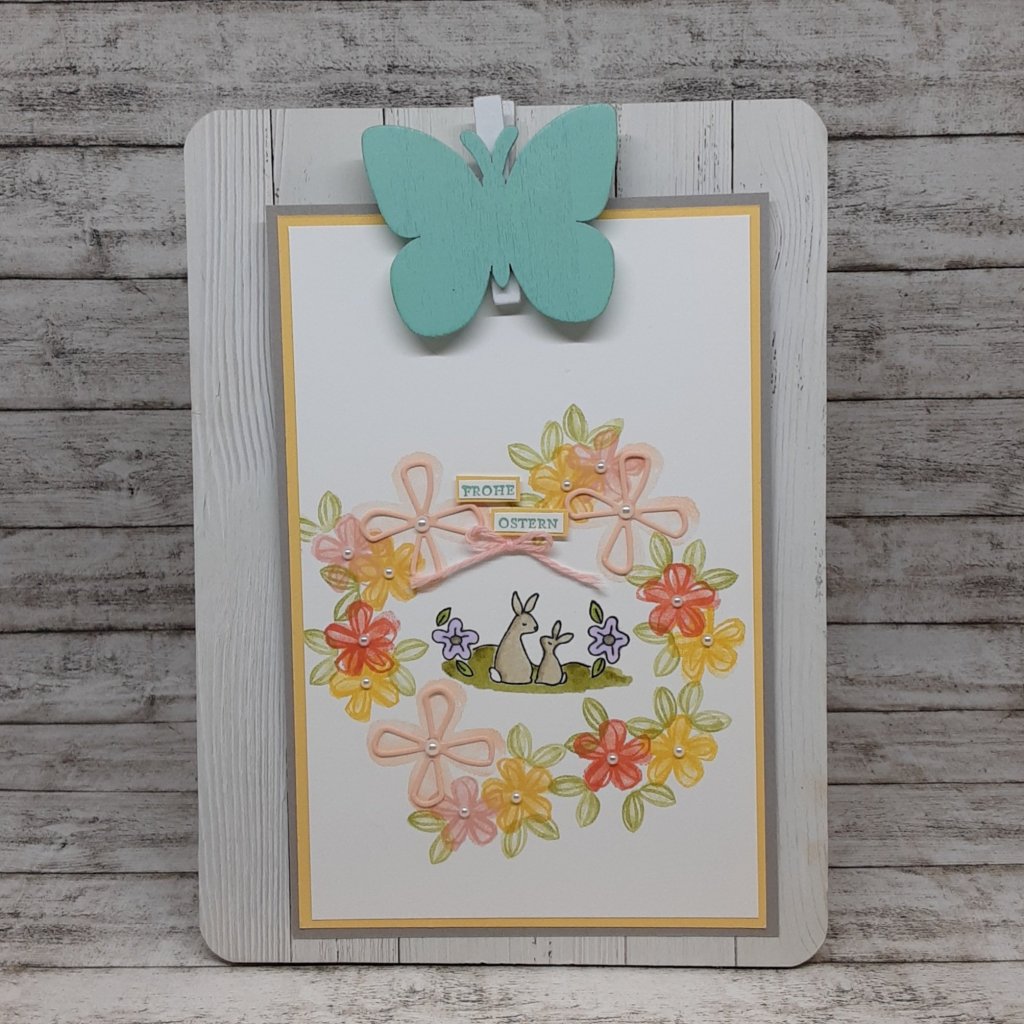 Oben hatte ich noch eine Lücke im Blütenkranz und so fand der Spruch „Frohe Ostern“ aus dem Stempelset Klitzekleine Grüße von stampin up nebst einer kleinen Schleife schnell seinen Platz.