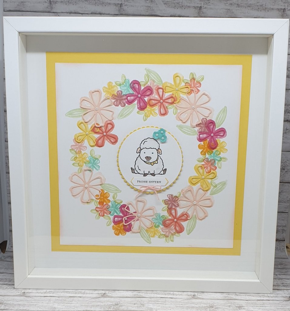 Gestern habe ich mich an den Basteltisch gesetzt und schwups ist ein Layout für meinen Ribba-Rahmen entstanden. Natürlich dekoriert für Ostern. Genutzt habe ich das Produktpaket Blüten voller Freude und das alte Stempelset Österliche Grüße von stampin up. So sieht er aus;