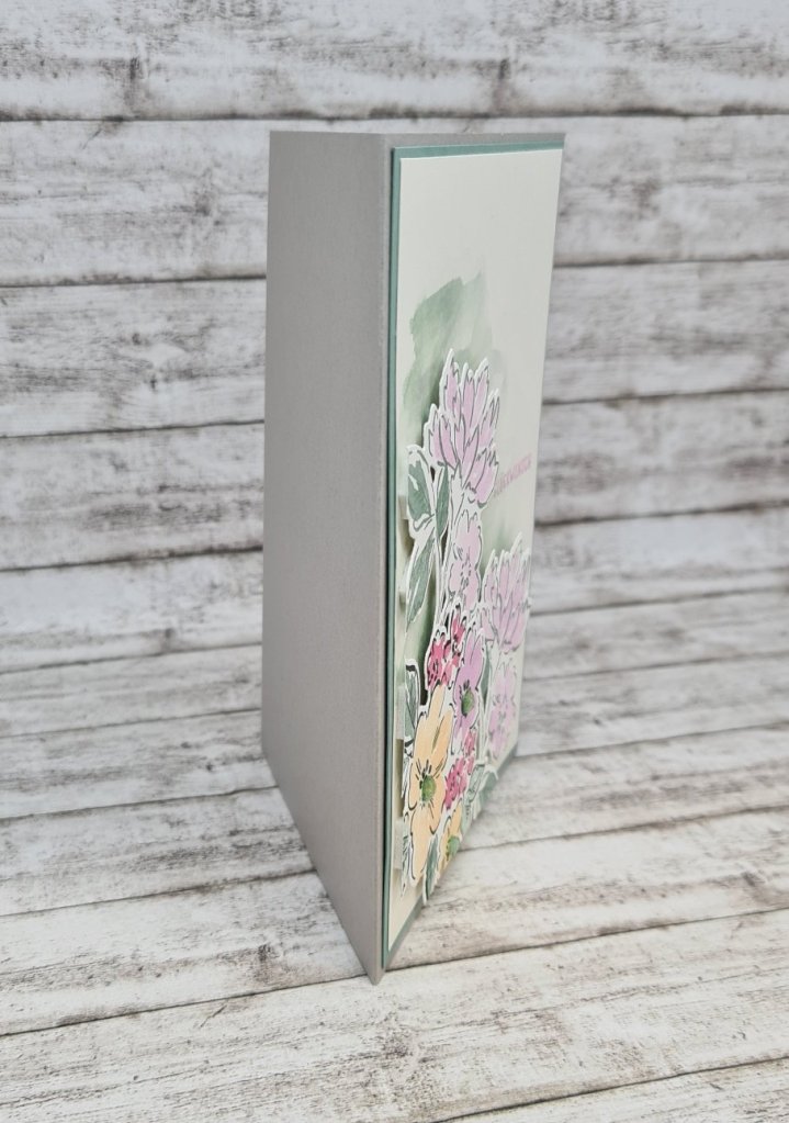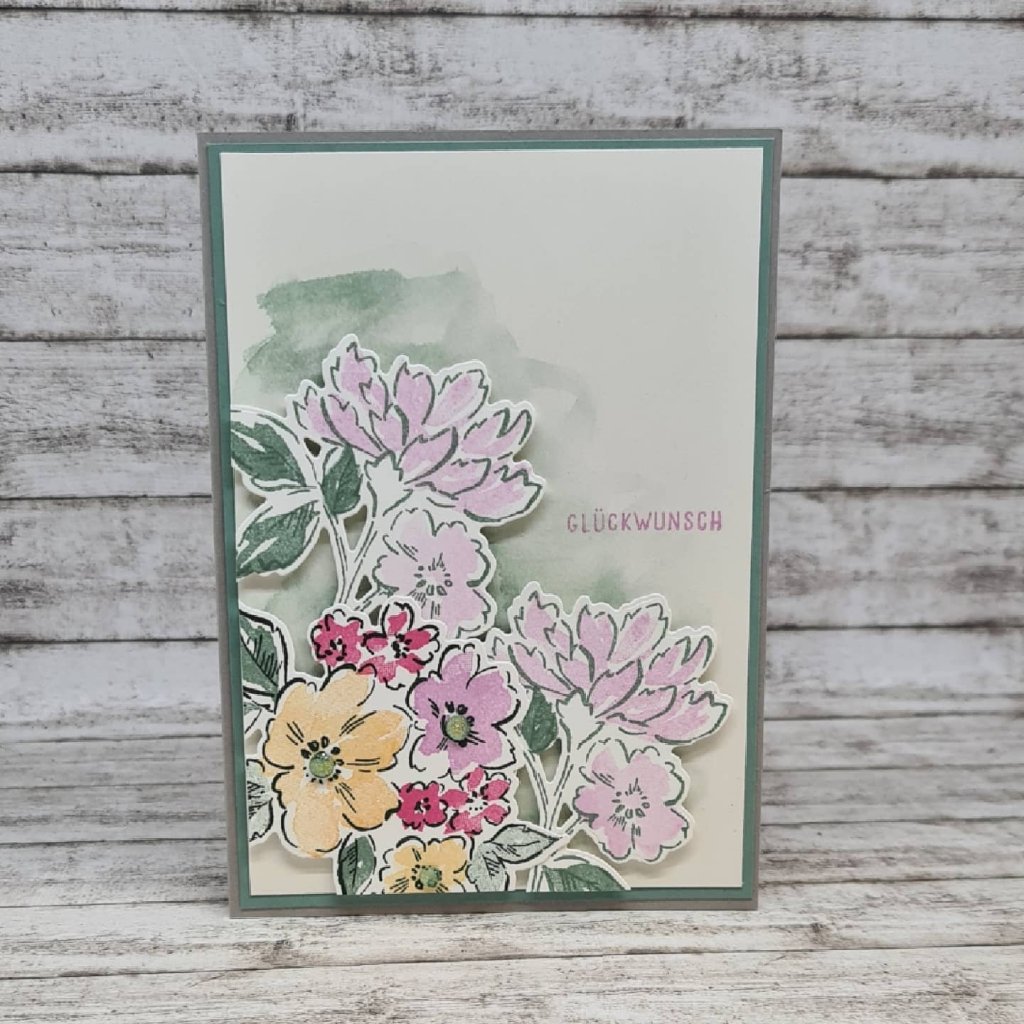 Aber es fehlt ja noch Seladon, richtig? Diese Incolor habe ich mir für eine – für mich – besondere Karte: mit Watercolor-Hintergrund. Und das mache ich ganz selten. So sieht sie aus: