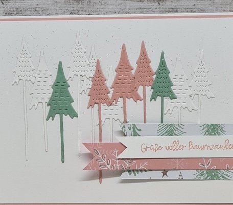 Die Bäume habe ich in Grundweiß, Kirschblüte und Minzmakrone ausgestanzt. Die farbigen Bäume habe ich noch mit dem Wink of Stella klar beglitzert.