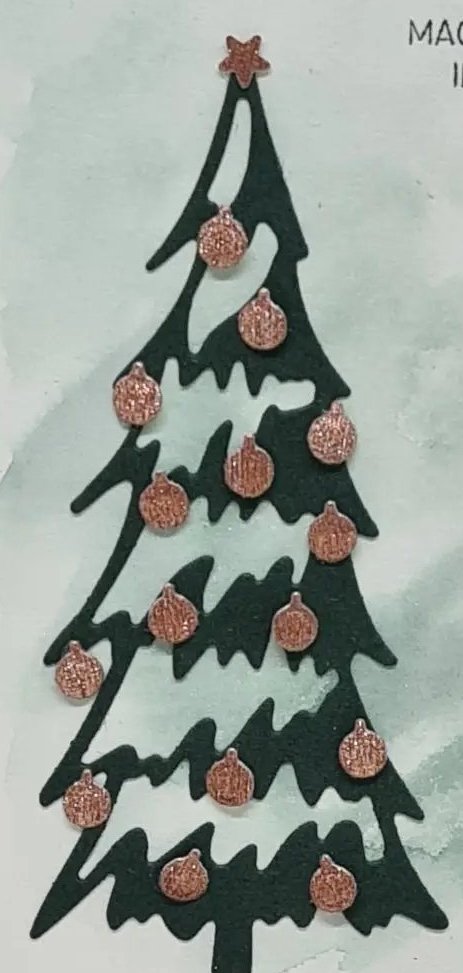 Den Hintergrund habe ich in Seladon in Aquarelltechnik gestaltet. Den Tannenbaum habe ich in Lodengrün, die Kugel aus dem Spezialpapier Metallic in Rosegold ausgestanzt.