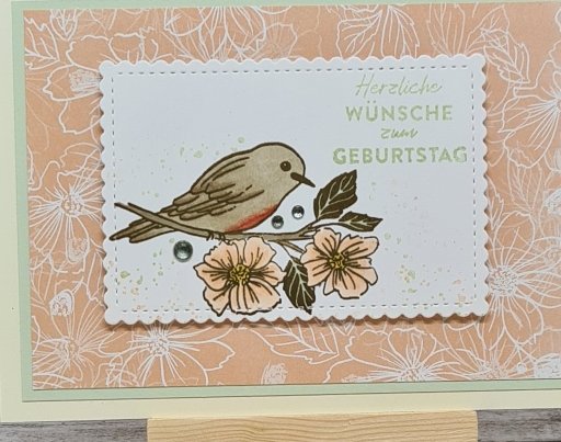Den Vogel auf dem Ast habe ich dem Stempelset entnommen, in Wildleder abgestempelt und mit den stampin blends coloriert.