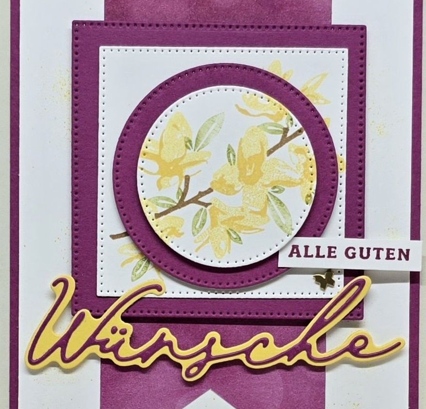 Für das Hauptmotiv habe ich den Blütenzweig direkt auf das Quadrat gestempelt und anschließend einen Kreis daraus ausgestanzt.