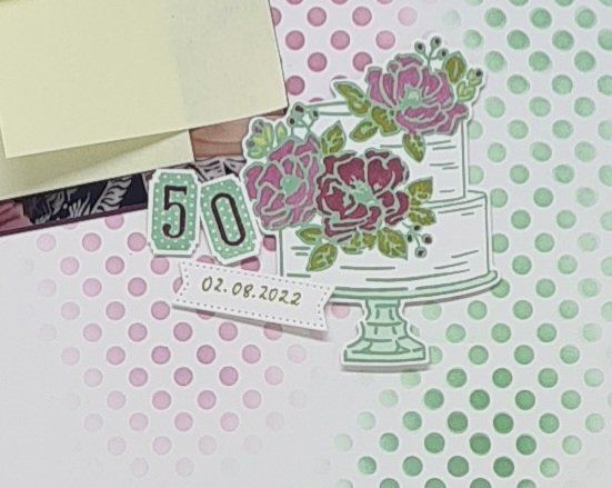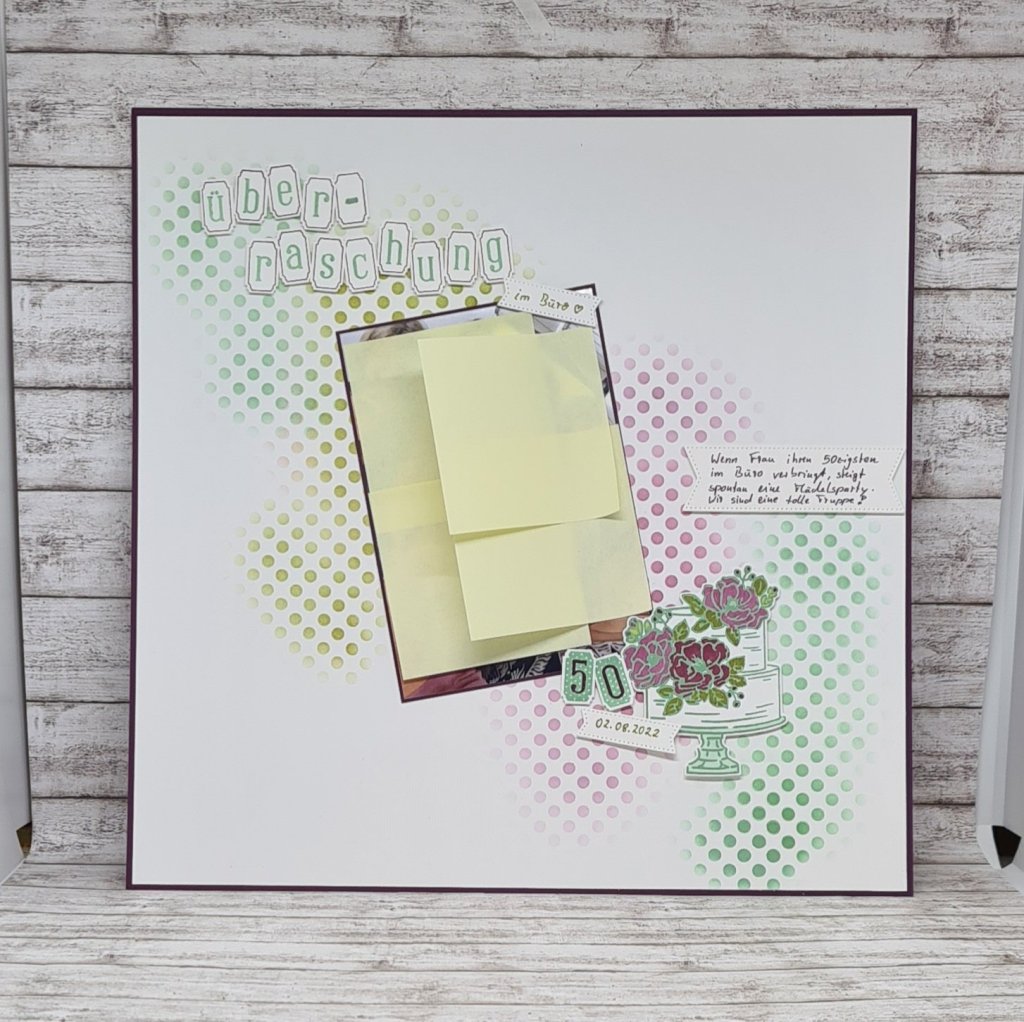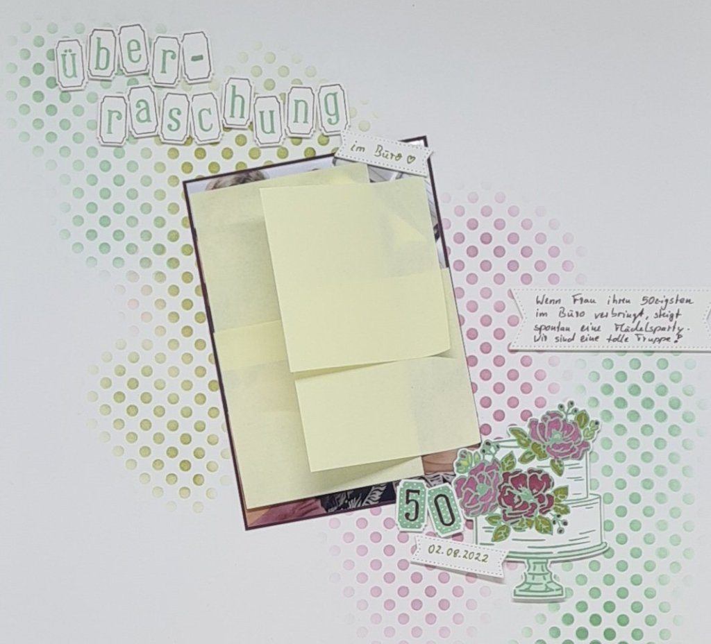 Für das Layout habe ich alte Schablonen genutzt und mit den Blending Pinseln in den drei Farben gewischt. Da das abgedeckt Foto eine Erinnerung an meine Überraschungsparty im Büro zu meinem 50zigsten Geburtstag ist, war es klar dass ein Geburtstagskuchen mitverarbeitet werden musste.