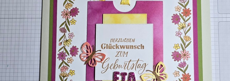 Huhu,Heute zeige ich euch eine Karte in DINA4. Die Bordüre habe ich mit dem SAB-Set Corner in bloom gestempelt, dass ihr euch für einen Eunkauf ab 140 Euro gratis in den Warenkorb legen könnt. Coloriert habe ich mit gaaaannnzzz vielen stampin blends, denn die Bordüre sollte bunt werden. Die Machart der Karte ist sehr simpel.… Weiterlesen Glückwunschkarte in DINA-4 – viel Platz für Wünsche und Unterschriften