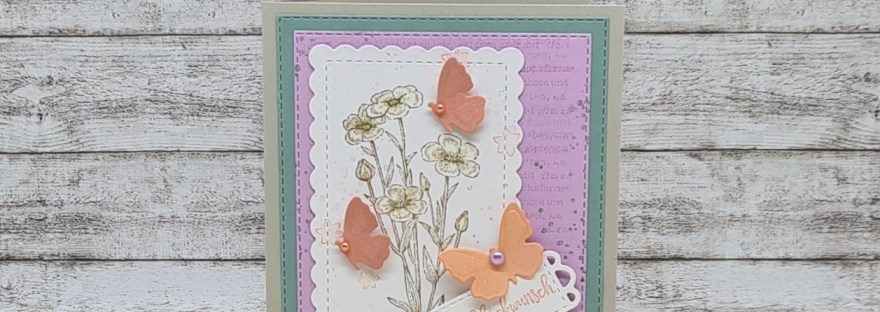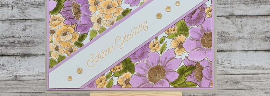 Hallo ihr Lieben, Heute zeige ich euch eine Glückwunschkarte mit dem Stempelset Landsegen in Kombination mit dem Sale-A-Bration-Set Für Allerlei Anlässe. So sieht die Karte aus: Stempelset Landsegen Dieses Mal habe ich die Blüten mit den stampin blends in Fresienlila und Papaya coloriert. Für die Blätter habe ich Olivgrün, für die Blütenmitte Bronze genutzt. Stempelset… Weiterlesen Glückwunschkarte mit dem Stempelset Landsegen von stampin up!